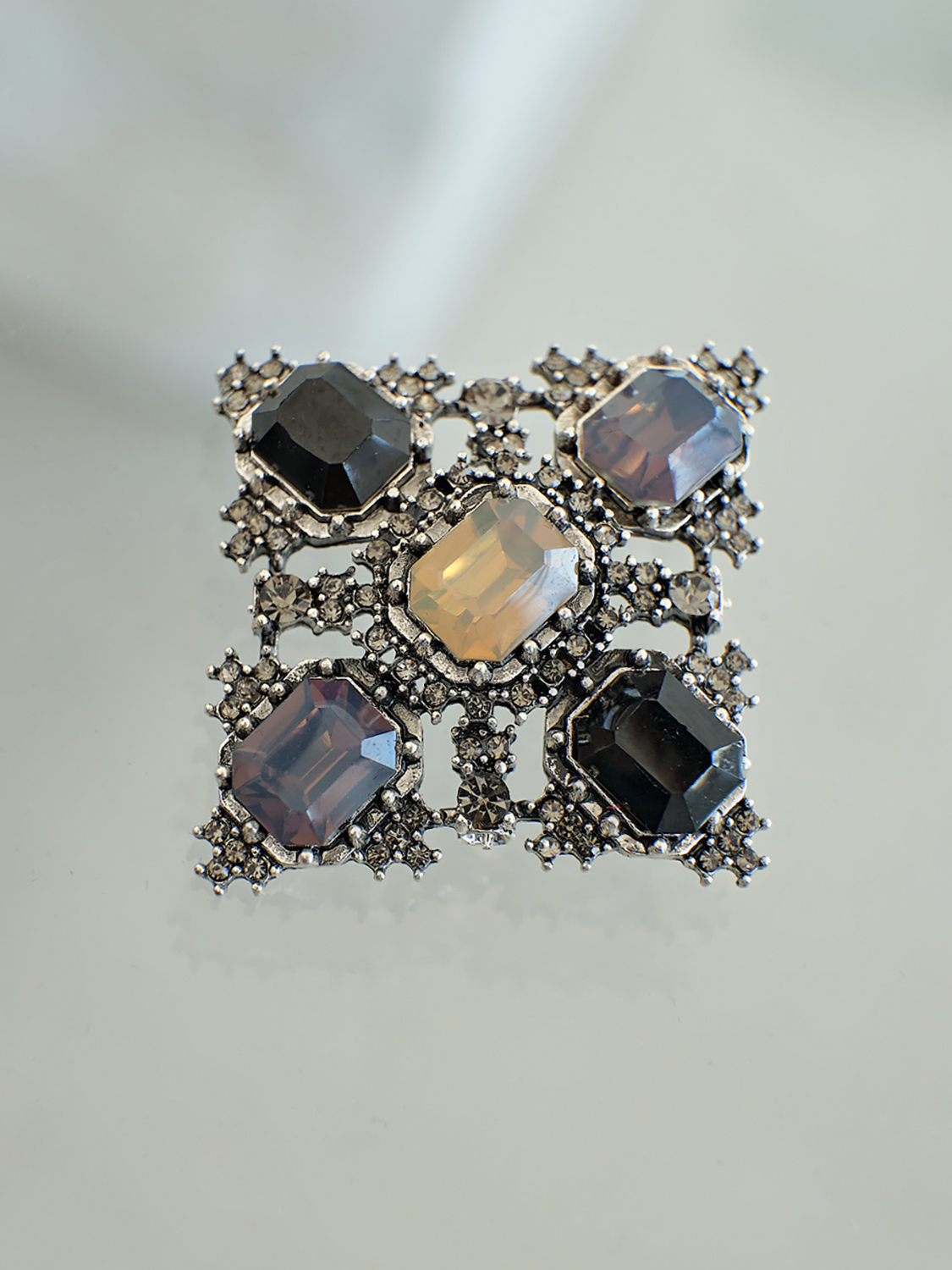 Роскошная брошь в форме ромба. Выполнена из комбинированных материалов с использованием горного хрусталя.