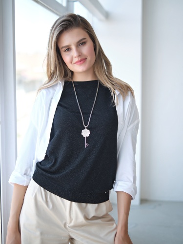 Стильная подвеска в виде ключа. Выполнена из комбинированных материалов, богато украшена стразами.