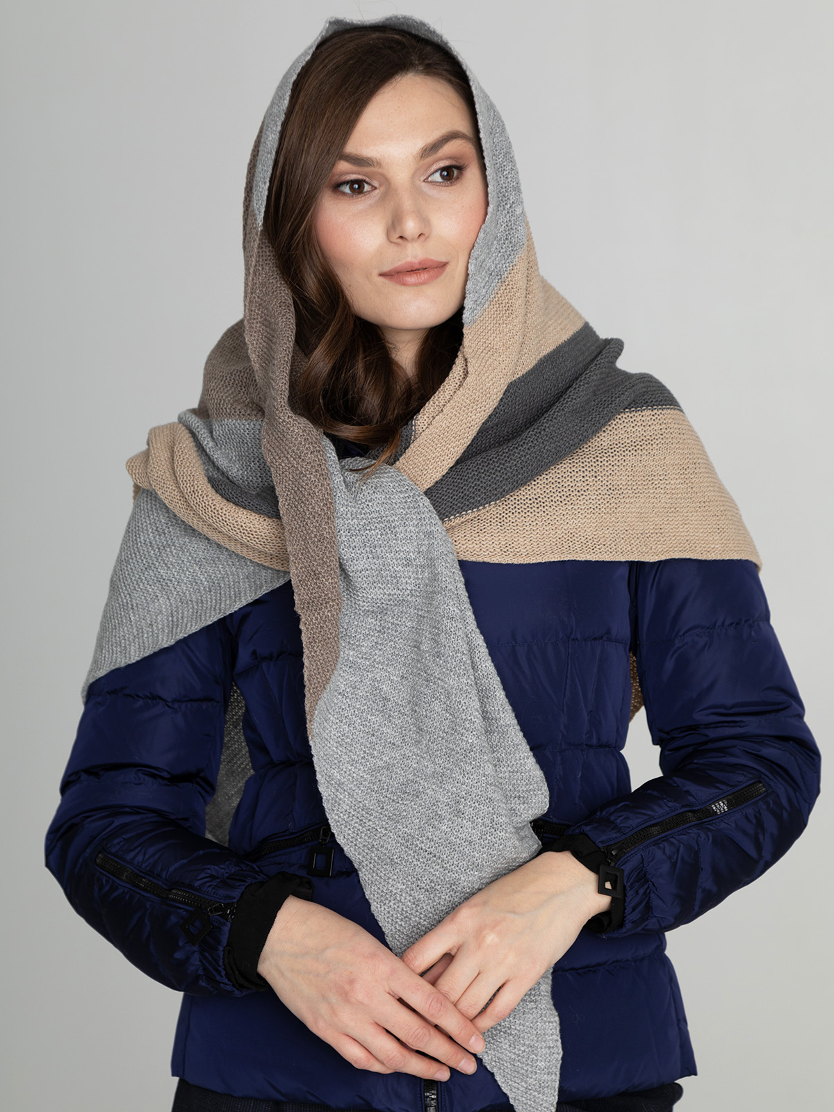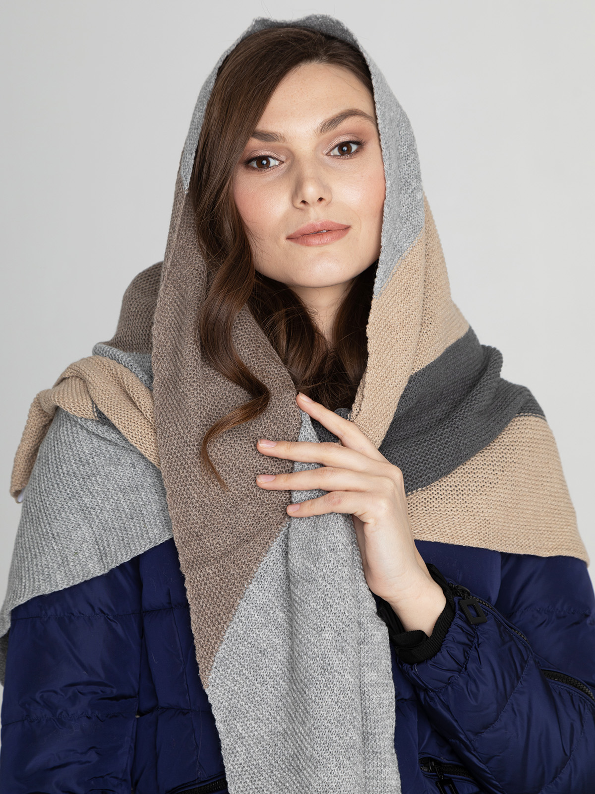 Косынка из смесовой шерсти с добавлением кашемира приятна на ощупь и хорошо сохраняет тепло. Универсальная базовая модель легко сочетается с различными нарядами.