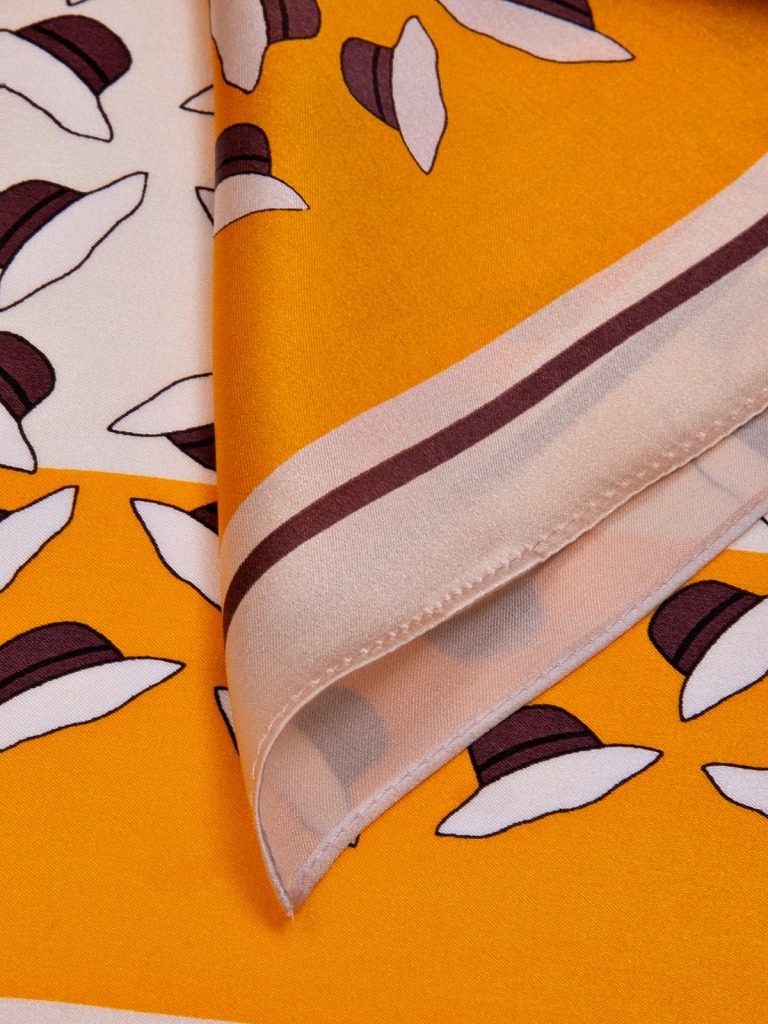 Платок с принтом из 100% шёлка. Тип плетения: Сатин. Размер: 53х53 см. Машинная подгибка.