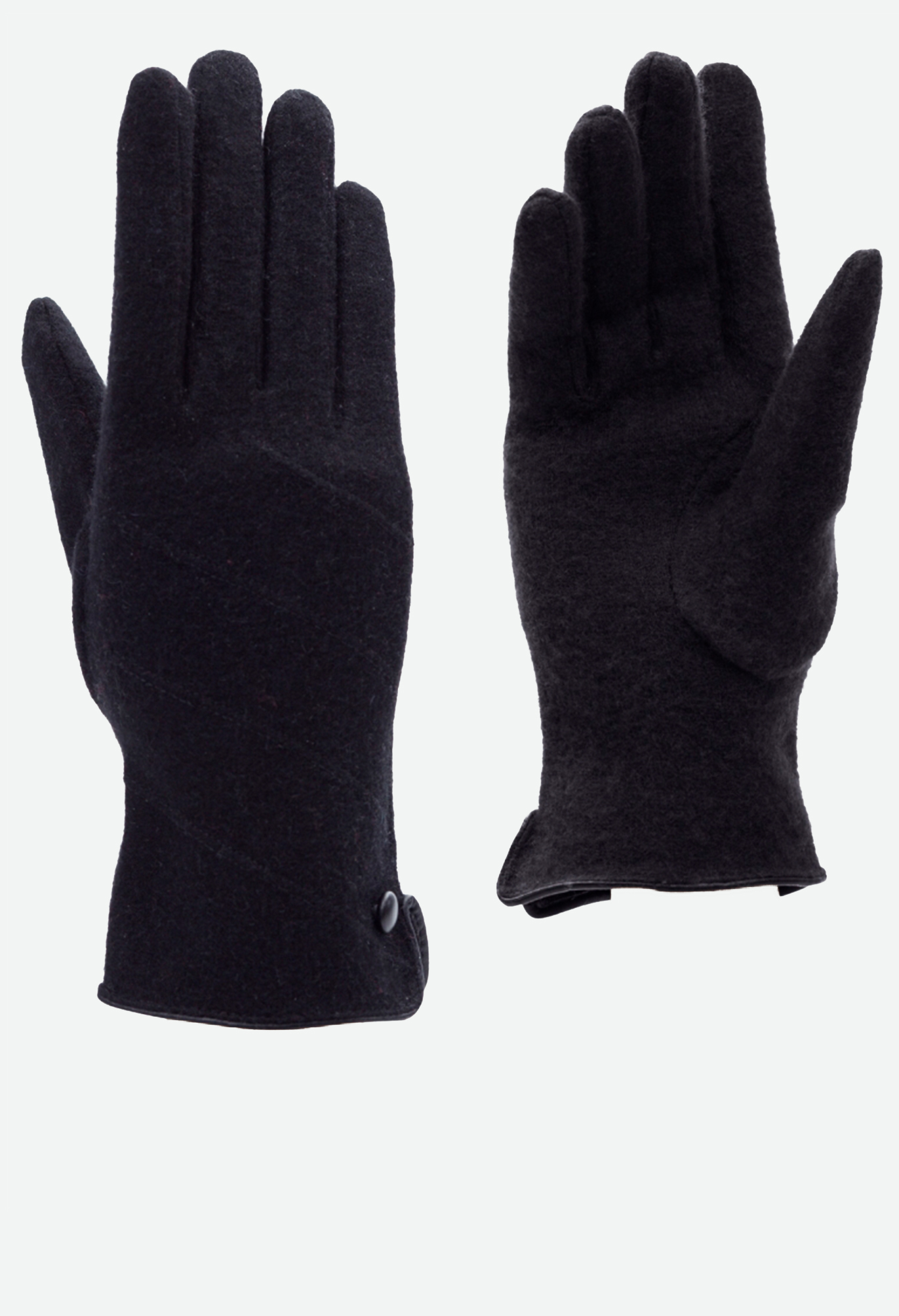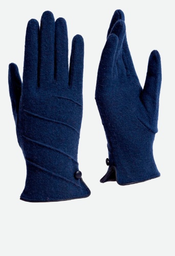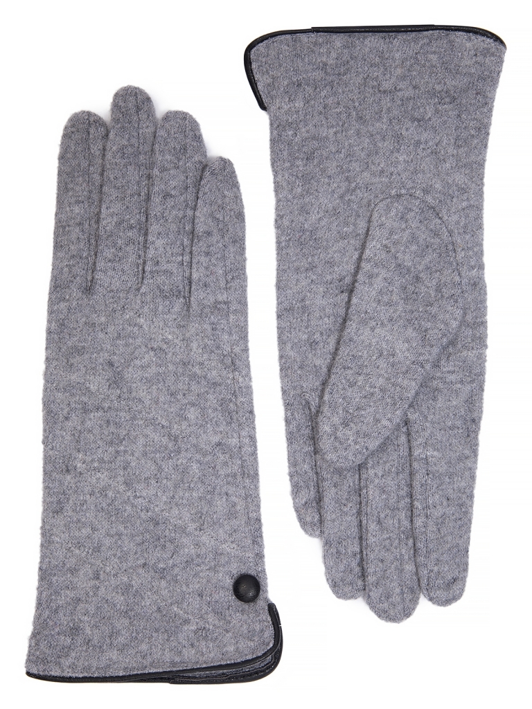 Перчатки выполнены из трикотажной шерсти. Состав трикотажа: 80% шерсть, 20% нейлон. Без подкладки. Отделка - декоративные швы на лицевой стороне. Край манжеты и декоративная пуговица обтянуты заменителем кожи. Длина манжеты от нижней точки большого пальца до края перчатки - 6,5 см. Длина пальцев - средняя.