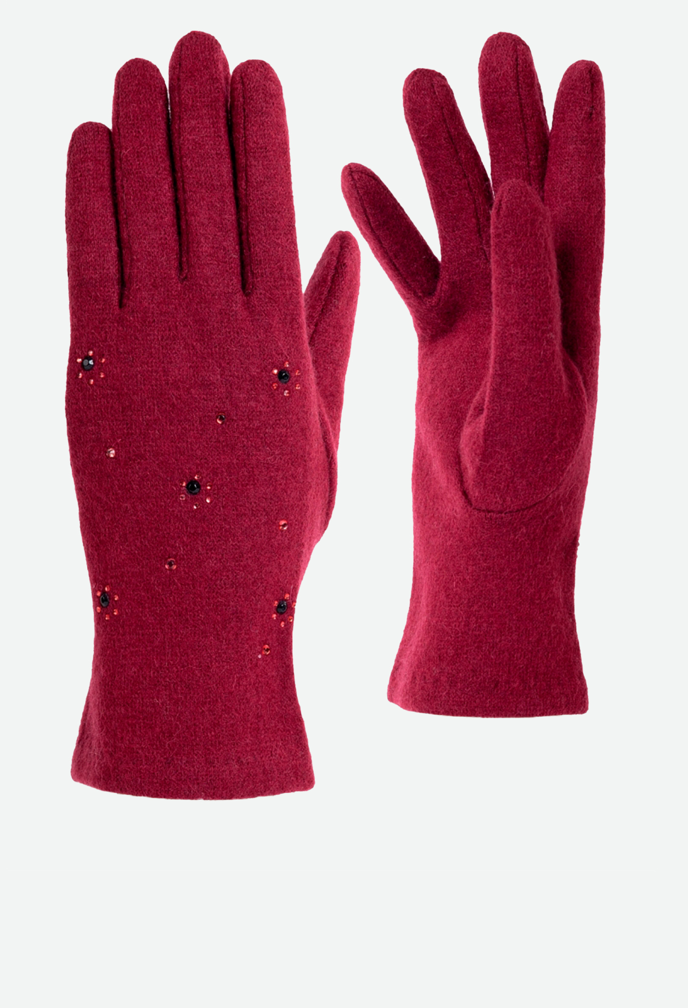 Перчатки выполнены из трикотажной шерсти. Состав трикотажа: 80% шерсть, 20% нейлон. Без подкладки. На лицевой стороне перчатки декоративная отделка из мелких страз в виде цветочков. Длина манжеты от нижней точки большого пальца до края перчатки 6,5 см. Длина пальцев - средняя.