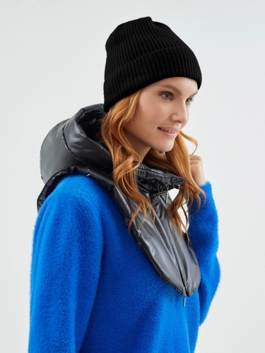 Съемный капюшон с манишкой из плащевой ткани черного цвета. Капюшон на молнии, имеет резинку и два фиксатора для регулирования объема капюшона. Капюшон очень теплый, внутрь встроены непродуваемая мембрана и утеплитель для защиты от ветра и дождя.