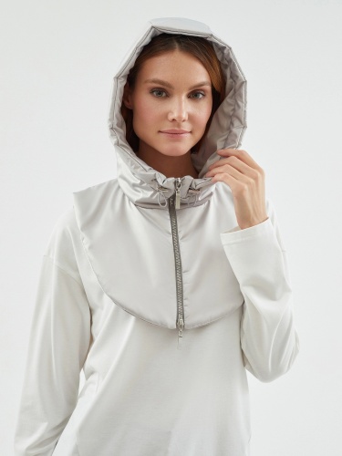 Съемный капюшон с манишкой из плащевой ткани серебристого цвета. Капюшон на молнии, имеет резинку и два фиксатора для регулирования объема капюшона. Капюшон очень теплый, внутрь встроены непродуваемая мембрана и утеплитель для защиты от ветра и дождя.