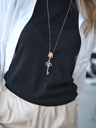 Подвеска в виде золотого ключика дополнит как повседневный, так и праздничный образ. Украшение инкрустировано вставками горного хрусталя.
