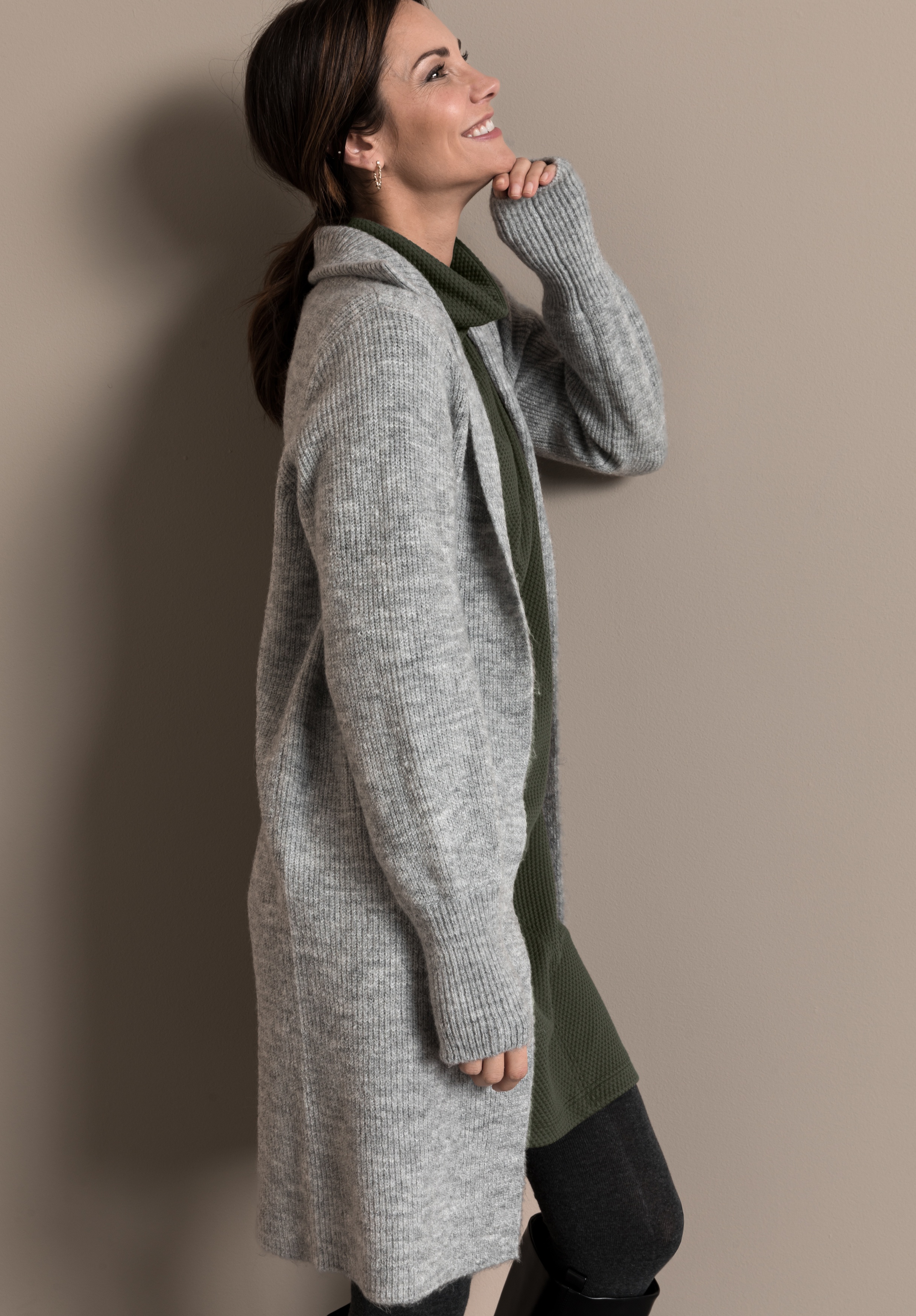 На сайте указаны российские размеры. Длинный кардиган, выполненный в модном стиле грубой вязки, не только очень приятный, но и стильный. Благодаря сочетанию мягкого материала с шерстью он кажется мягким и удобным в носке. Повседневный образ дополнен модным воротником-стойкой, широким низом рукавов и длинным свободным кроем. Длина в 44 размере около 88 см.