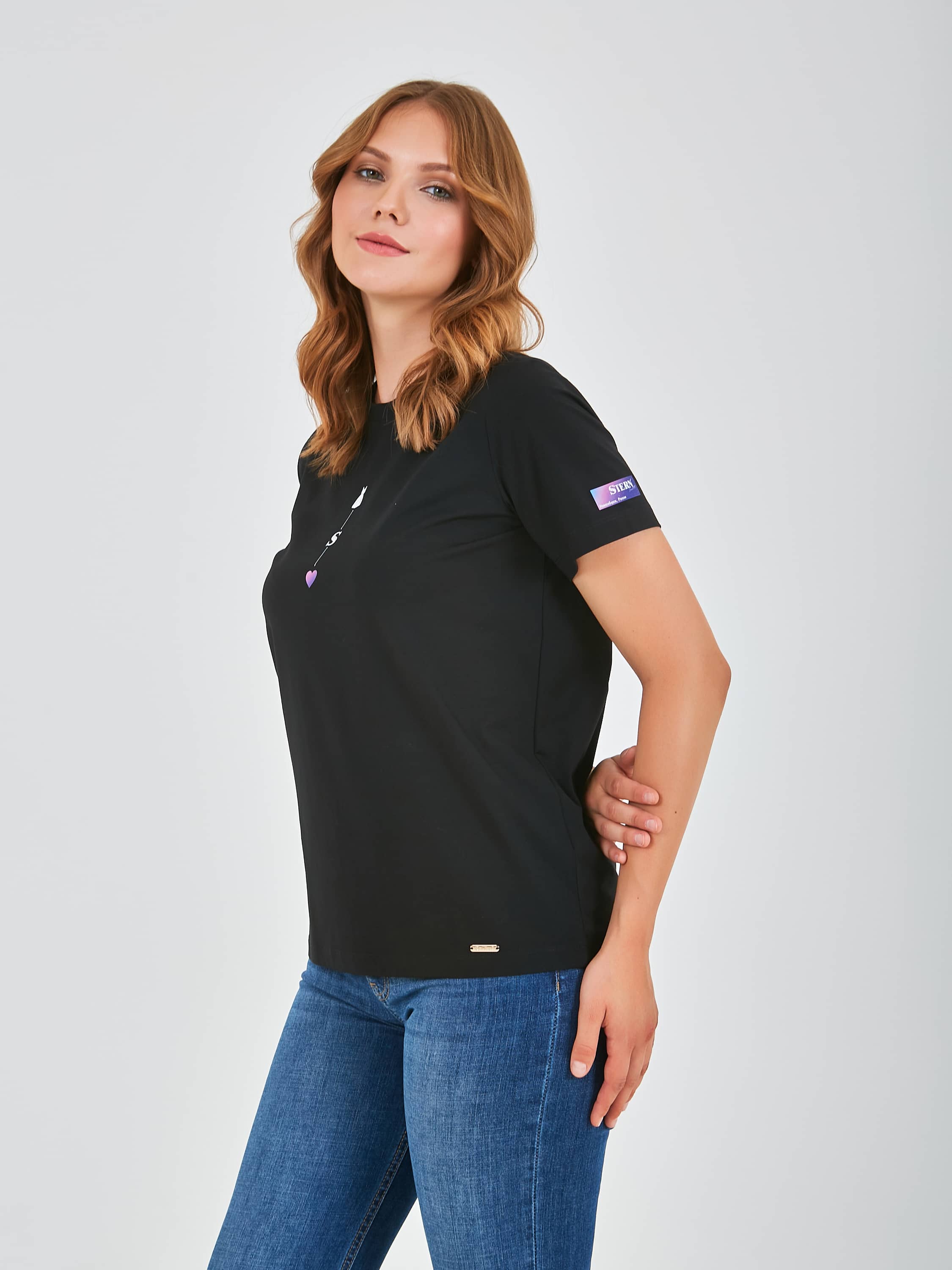 Яркая футболка средней длины прямого силуэта из легкого хлопка, мягкой вискозы и с добавлением эластана. Укороченные втачные рукава. Круглый вырез горловины.
