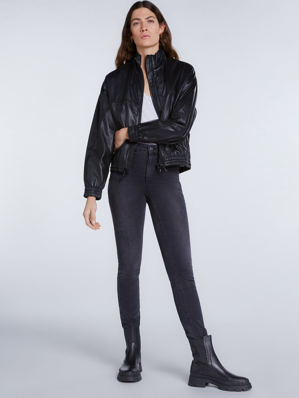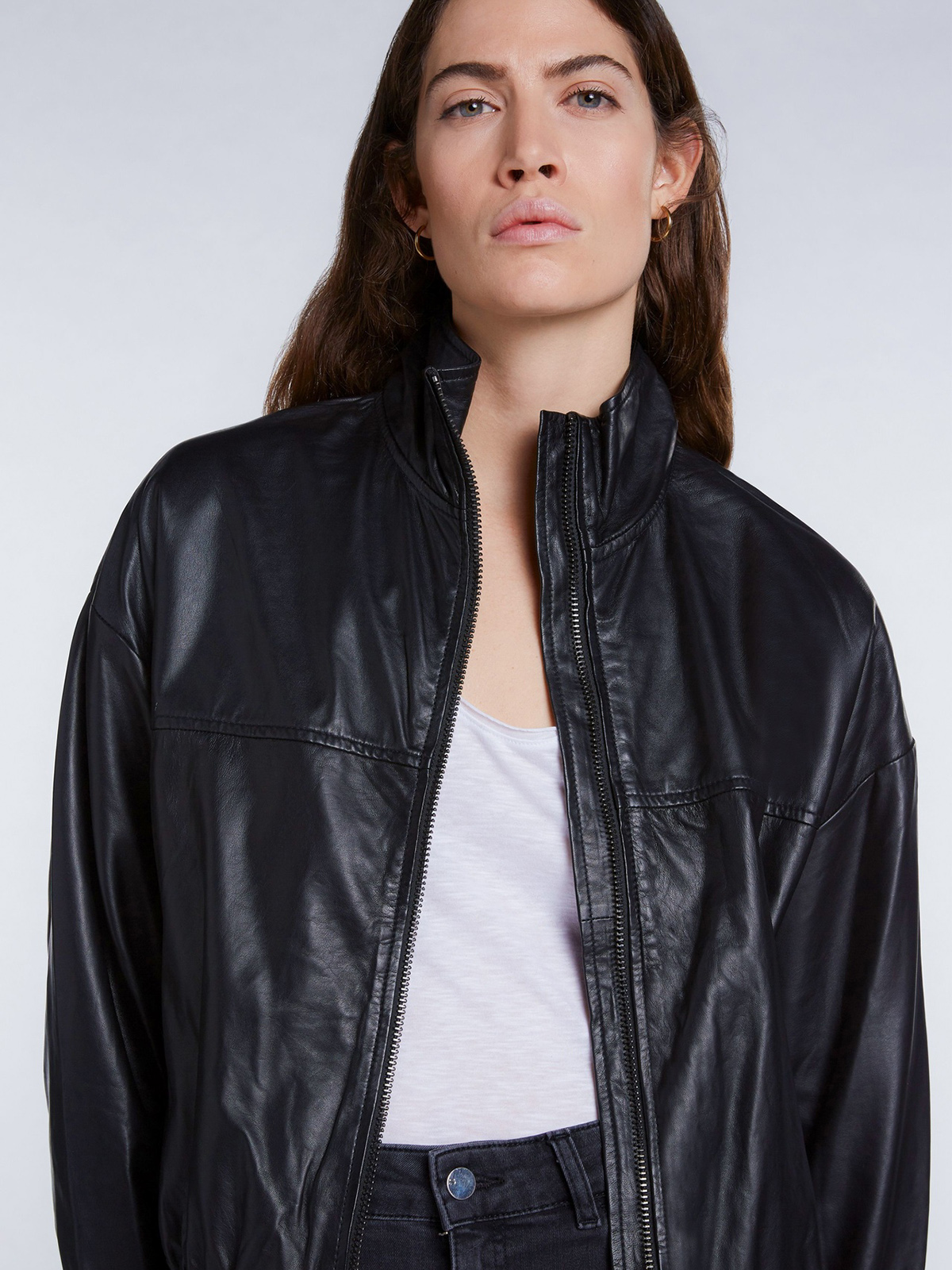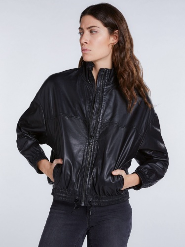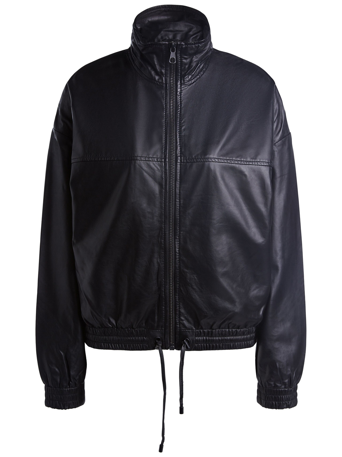Куртка свободного силуэта из натуральной кожи. Воротник стойка, спущенная линия плеча, втачной рукав полной длины с манжетой. Боковые карманы, эластичный пояс по низу изделия.