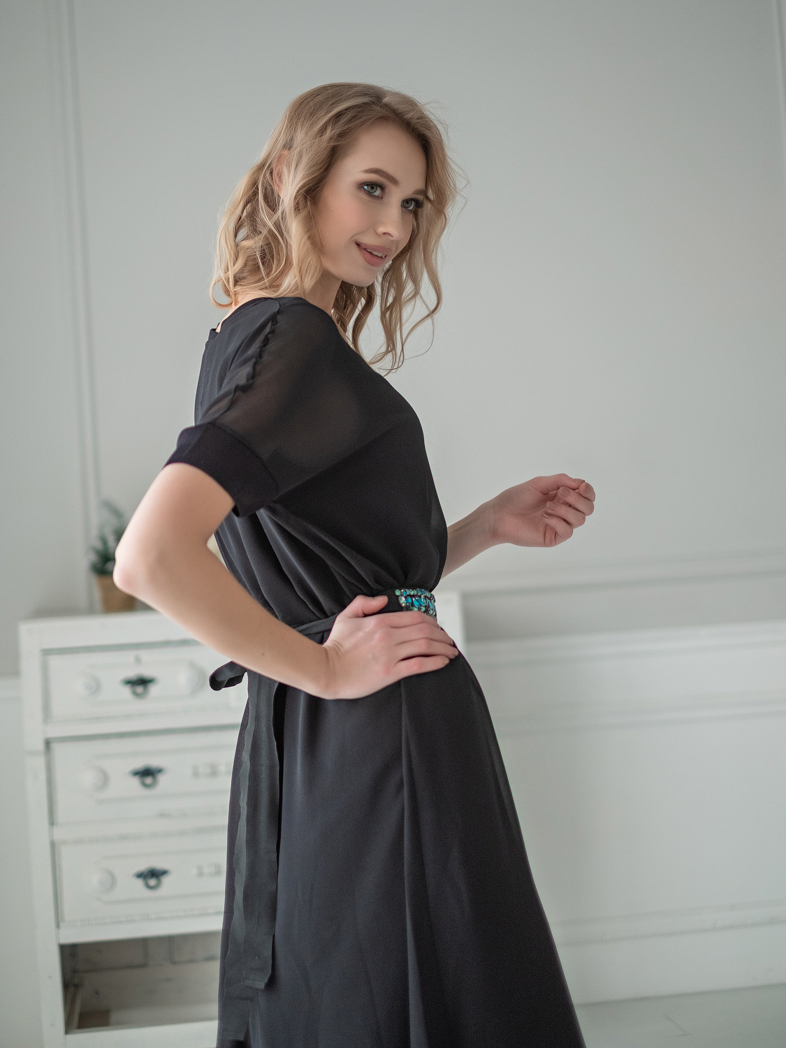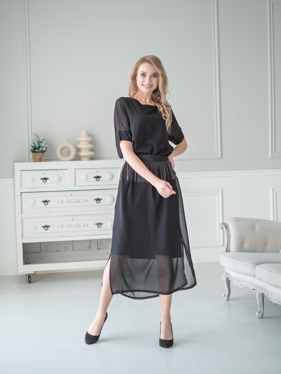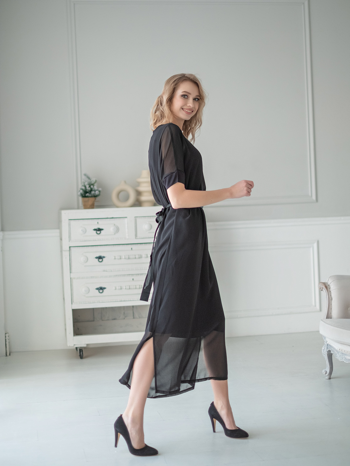 Двуслойное черное платье можно стильно сочетать с любыми аксессуарами! Нижний слой длиной выше колена, без рукавов. Верхний слой из легкой полупрозрачной сетки длины миди.