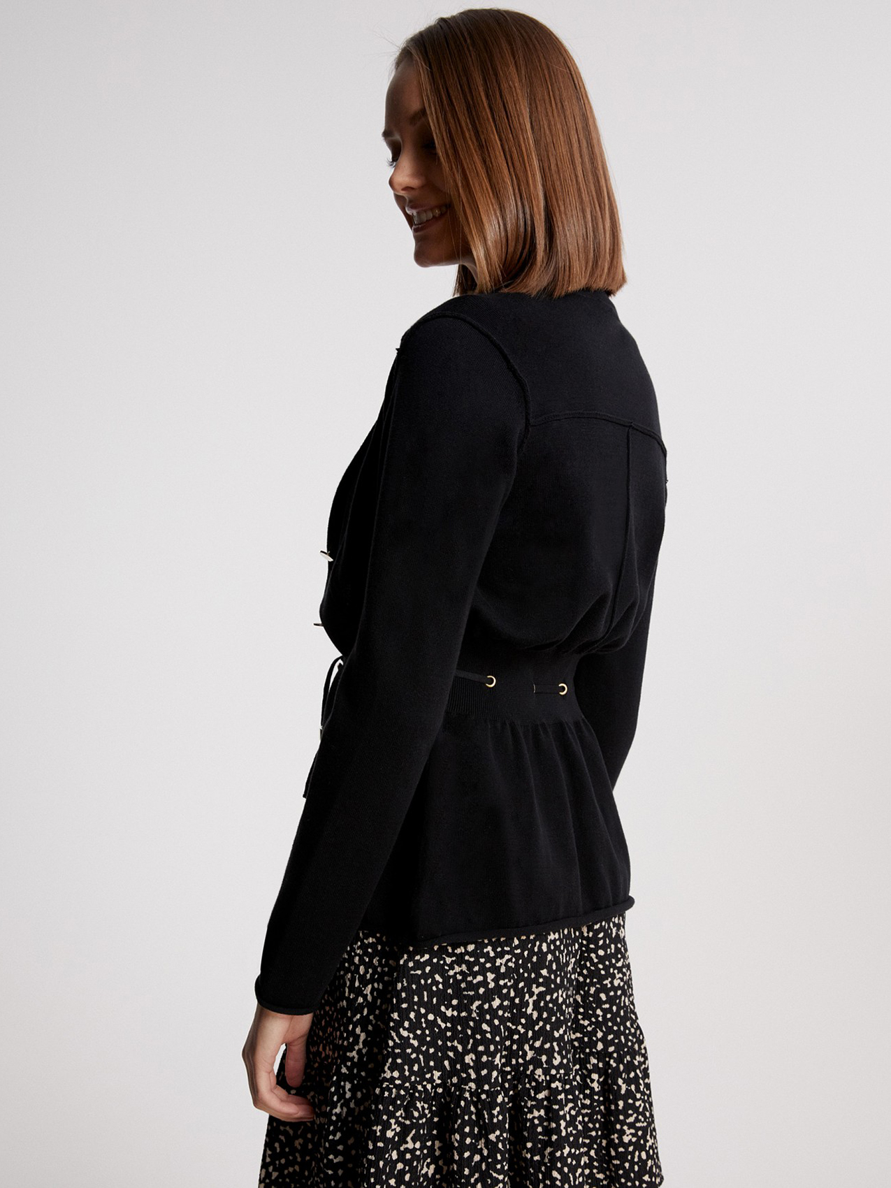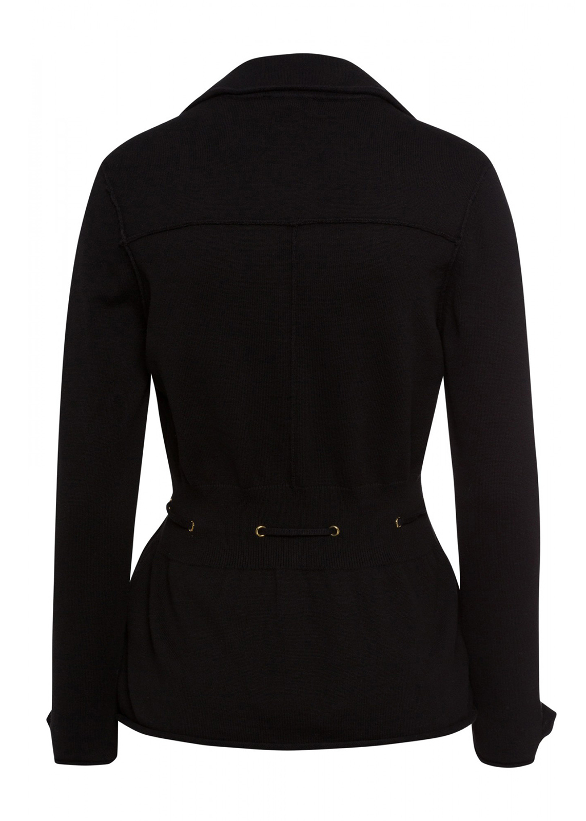 Черный жакет приталенного силуэта. Накладные карманы с клапаном. Втачной рукав полной длины с манжетами. Английский воротник.
