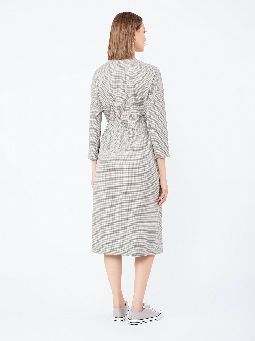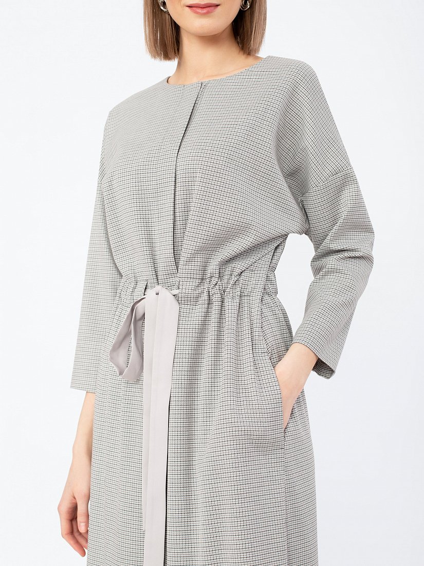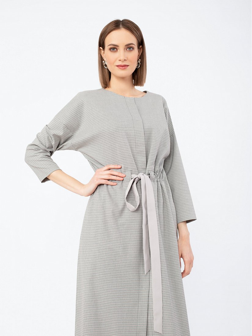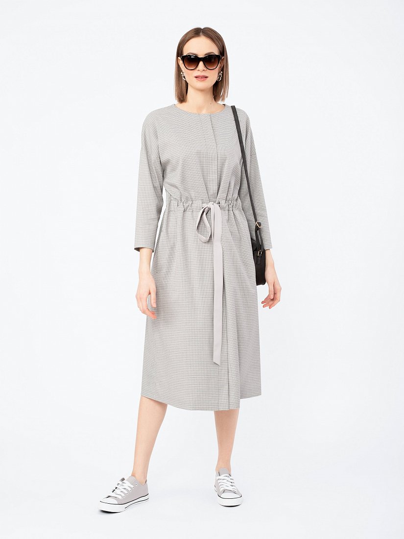 Платье в городском стиле идеально для повседневного ношения. Длина миди, полуприлегающий силуэт. Акцент на талии за счет кулиски и пояса контрастного цвета. Супатная застежка на металлические кнопки, боковые карманы. Рубашечный рукав 3/4, круглый вырез горловины.
