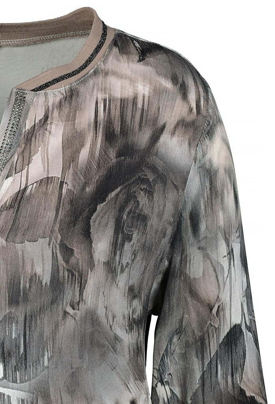 Блуза с абстрактым принтом. Втачной рукав 3/4 , v-образный вырез горловины украшен стразами.