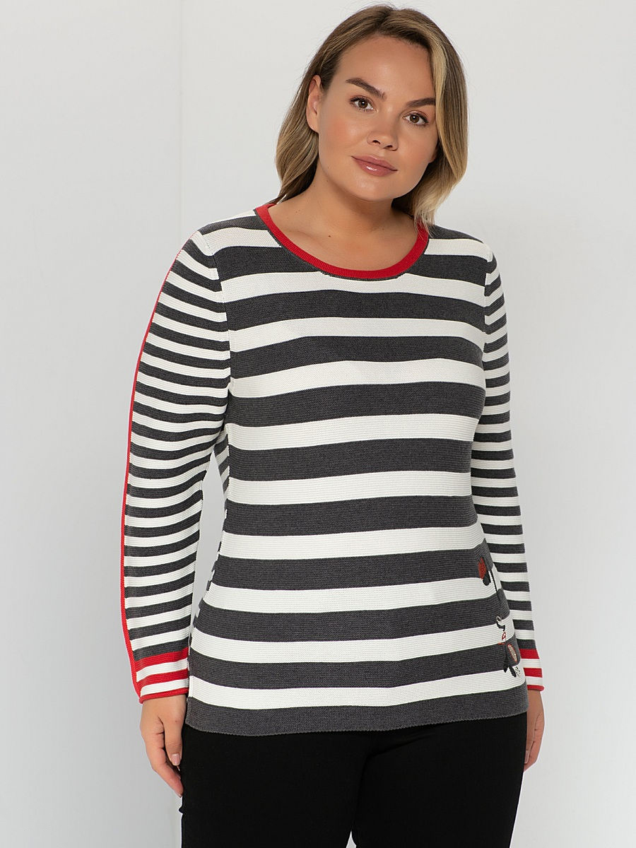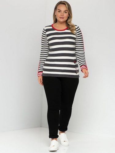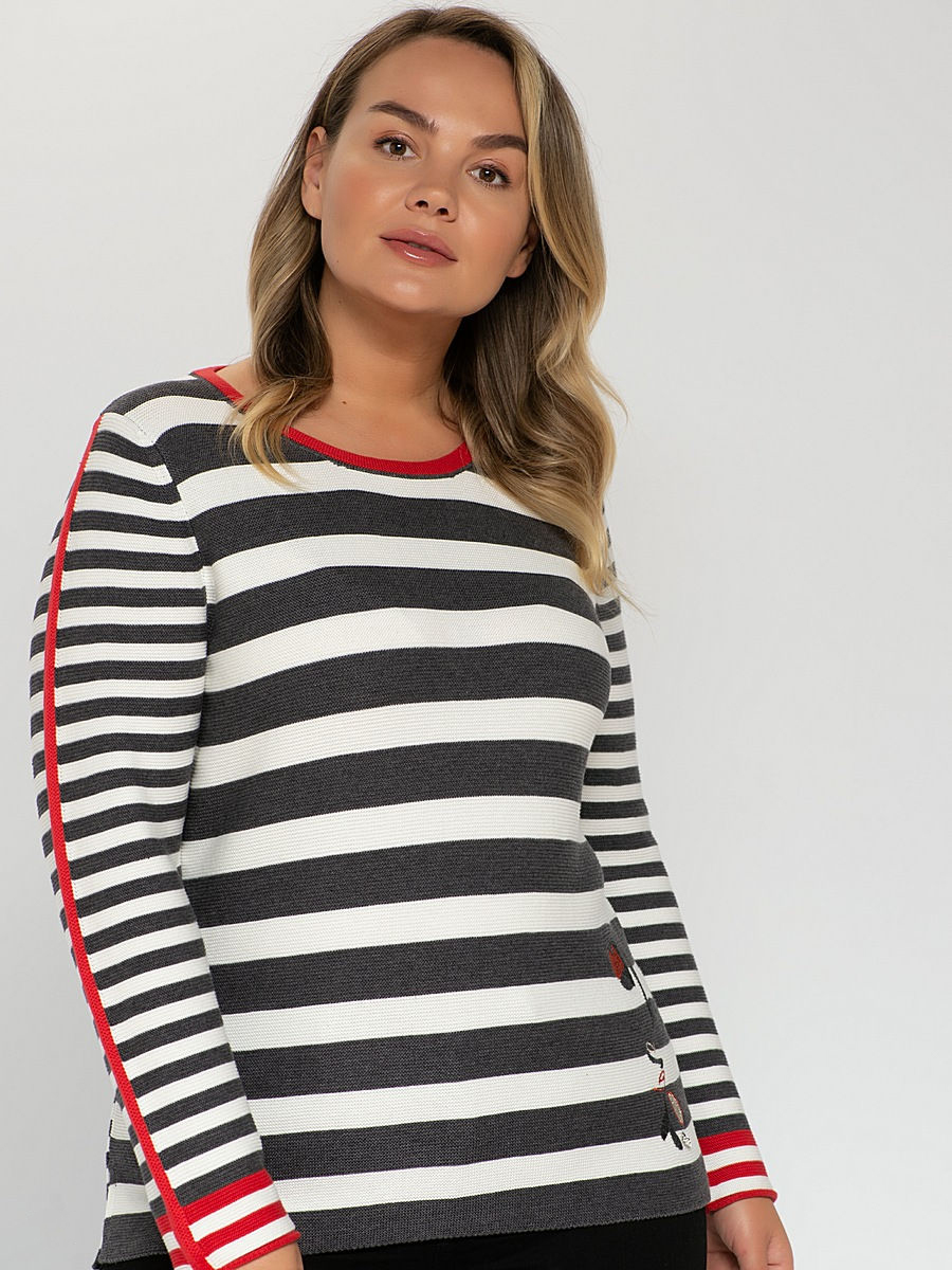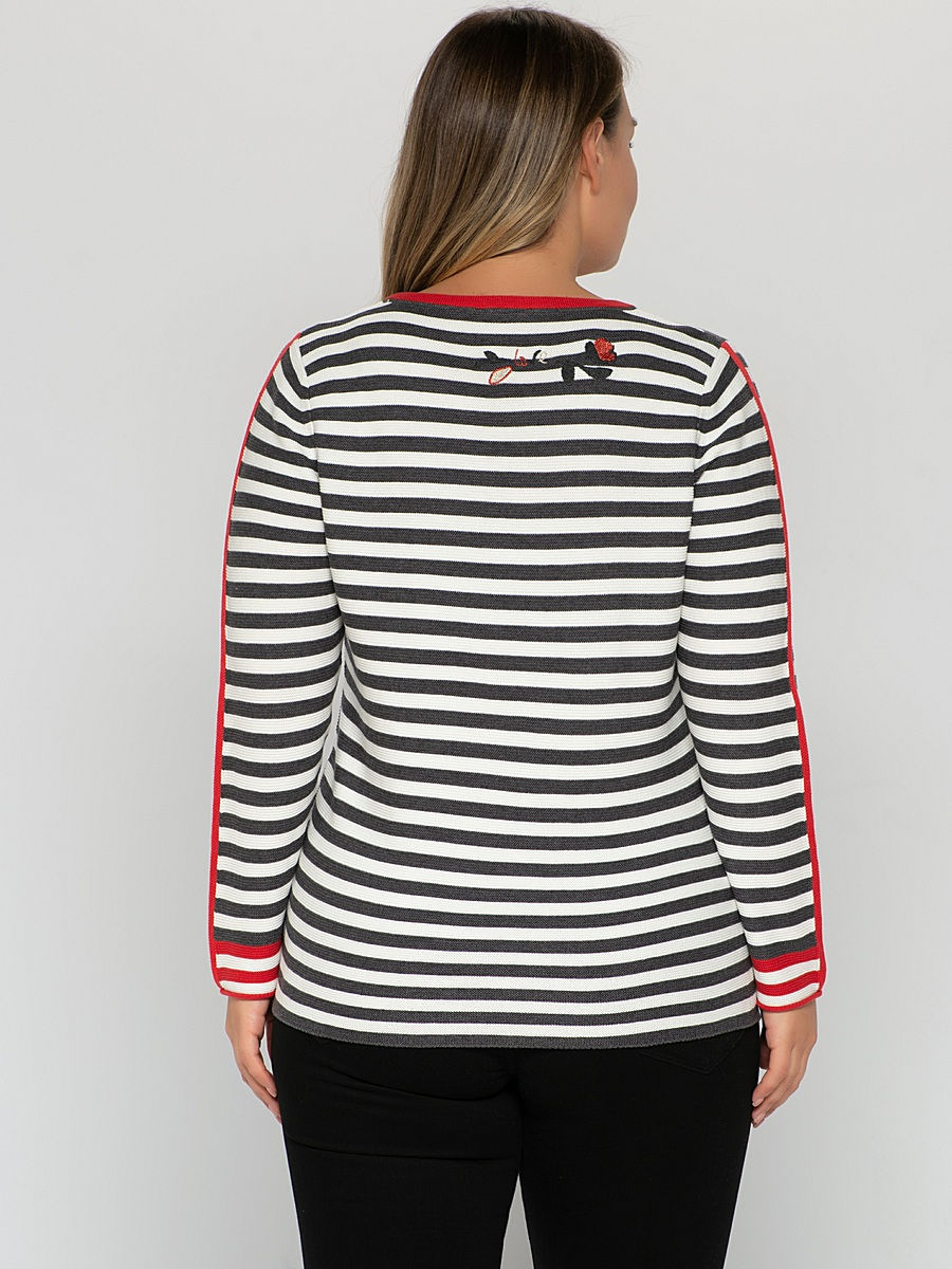 Джемпер полуприлегающего силуэта с круглым вырезом горловины и втачными рукавами полной длины. Полосатый дизайн с яркими акцентами на горловине и рукавах дополнен вышивкой на боку и на спинке. Материал из хлопковой смеси приятен к телу и удобен в ношении.