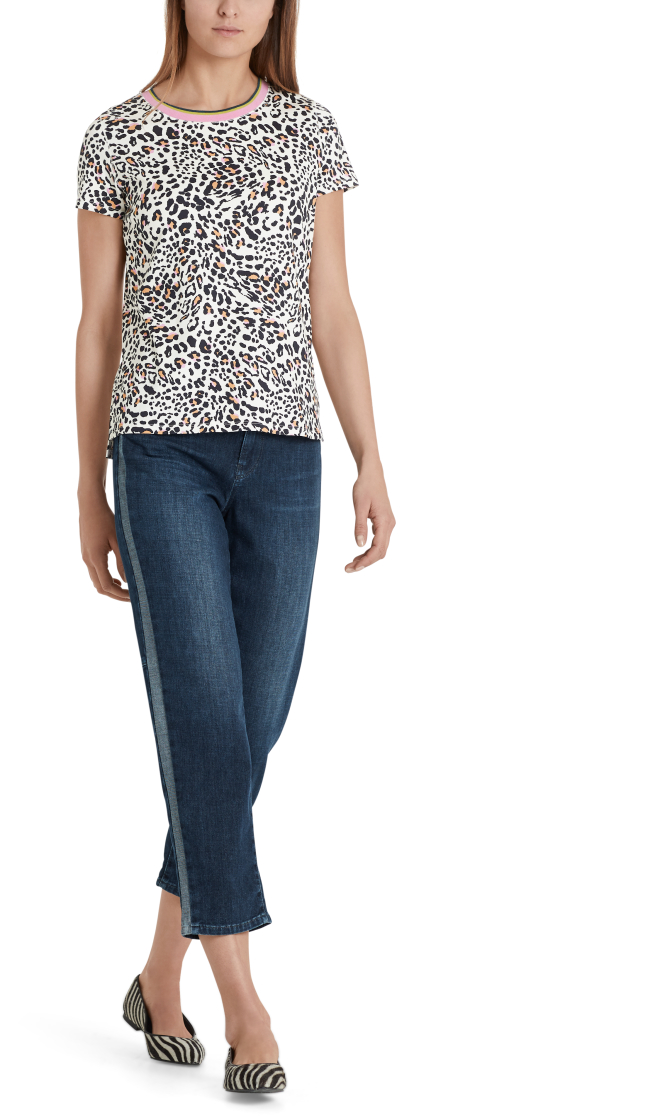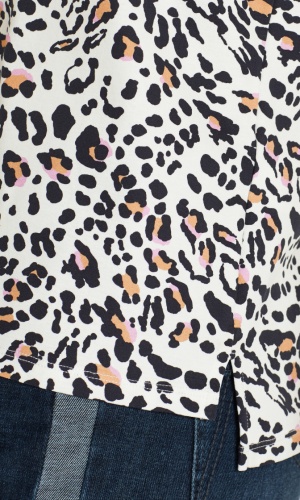 Футболка прямого покроя с анималистическим принтом. Круглый вырез горловины с контрастной обтачкой, короткие втачные рукава. Удлиненная спинка изделия, небольшие разрезы по бокам. Материал из хлопковой смеси приятен к телу и обеспечивает комфорт.