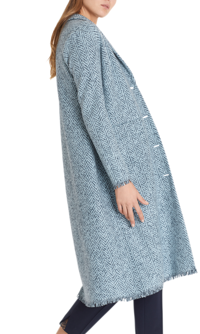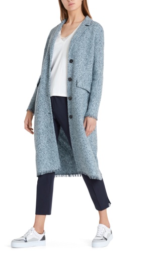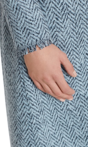 Летнее пальто. Английский воротник, втачной рукав полной длины. Застежка на пуговицы. Отделка бахромой по низу изделия и рукавов.