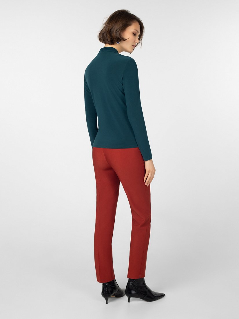 Блуза из трикотажа прилегающего силуэта с воротником стойка, v-образным вырезом горловины, мягкой стойкой и втачным рукавом полной длины. Спереди декоративный запах со сборкой. Идеально сочетается с костюмной группой.