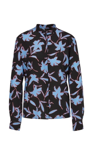 Блуза-рубашка прямого кроя. Воротник-стойка, застежка на пуговицы спереди со скрытой планкой, рукава полной длины с манжетами. Принт с цветочными мотивами. Приятный к телу шелковый материал.