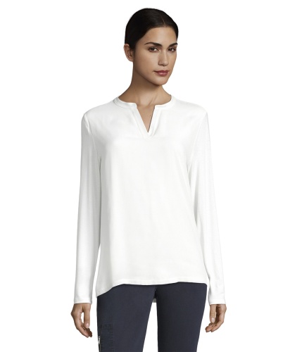 Белая блуза - необходимый элемент базового гардероба. Прямой покрой, V-образный вырез горловины, длинные рукава. Материал из вискозной смеси приятен к телу и обеспечивает комфорт. Эта простая элегантная модель является отличным компаньоном как для брюк, так и для юбки.