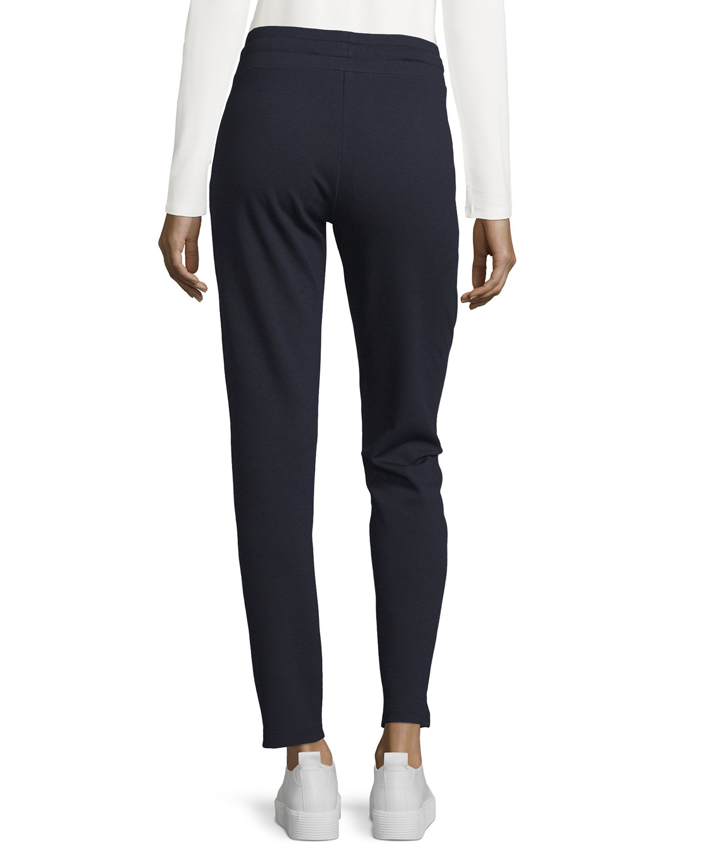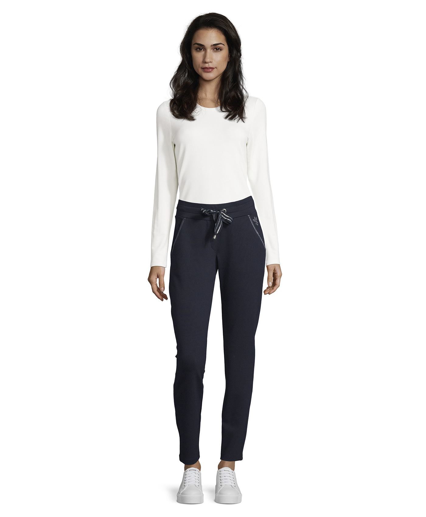 Быть спортивным - модно! А помогут в этом брюки в спортивом стиле. Прямой крой, средняя посадка, кулиска на талии. Карманы декорированы тесьмой. Материал из смеси вискозы, полиэстера и эластана приятен к телу и обеспечивает свободу движений. Эти брюки идеально подходят для прогулок и занятий спортом.