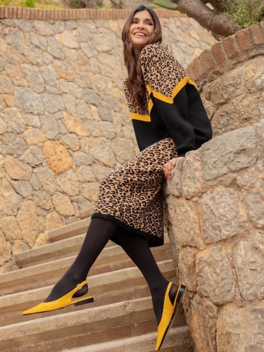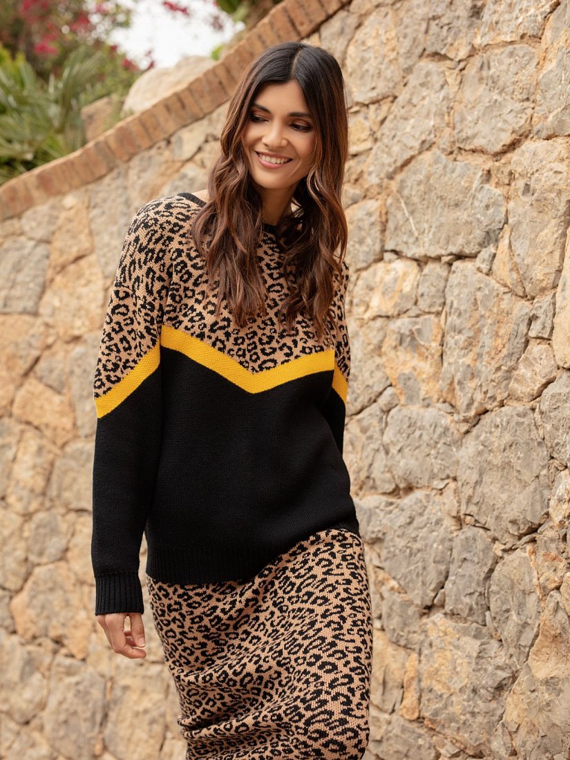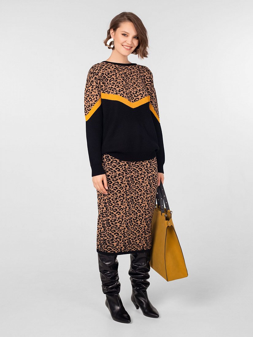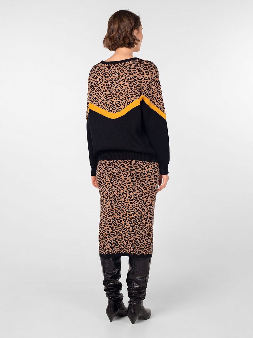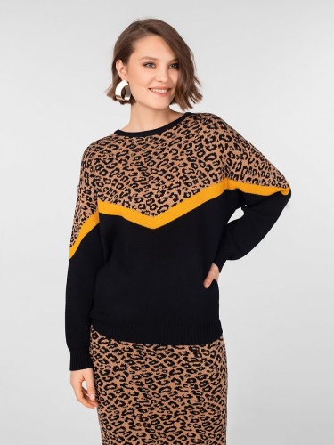 Джемпер из вязанного трикотажного жаккарда прямого силуэта с круглым вырезом горловины, спущенным плечом и рукавом полной длины с манжетой. Рисунок леопарда сочетается с контрастными желтыми полосками в спортивном стиле.