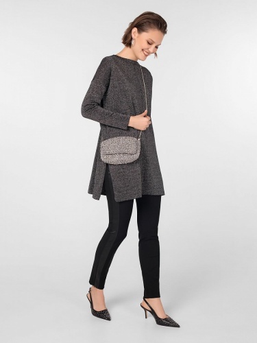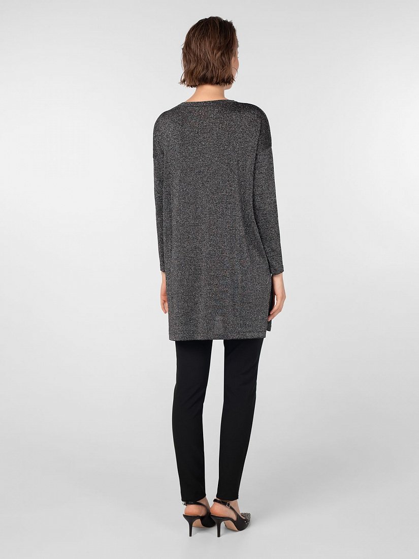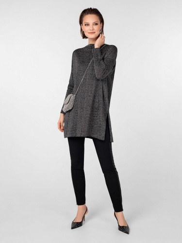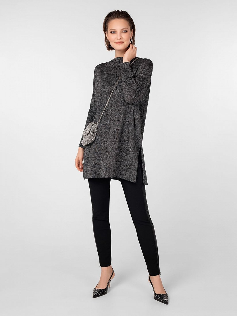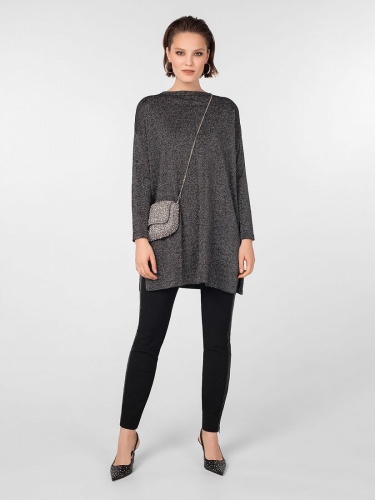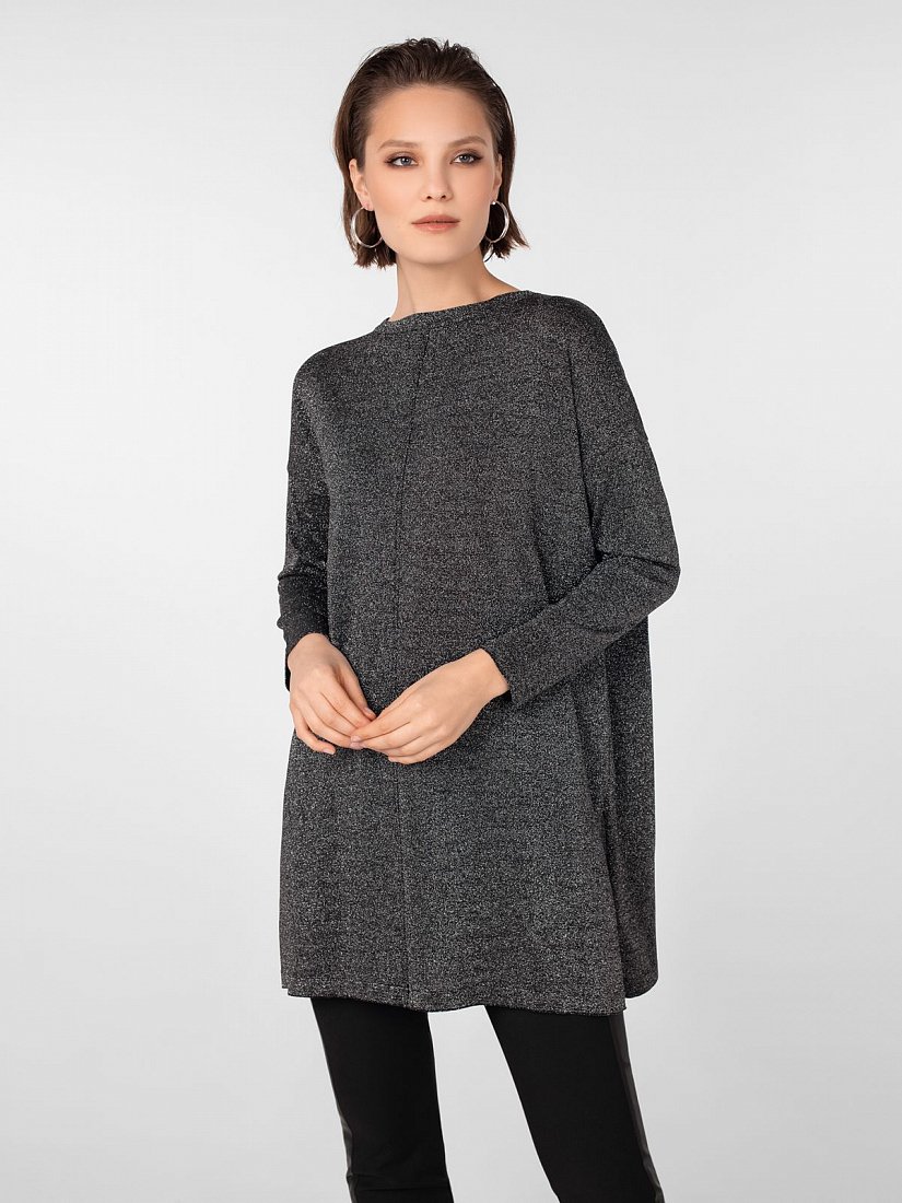 Джемпер из трикотажа прямого удлиненного силуэта с горловиной лодочка, спущенным плечом и рукавом полной длины. По низу по бокам разрезы.