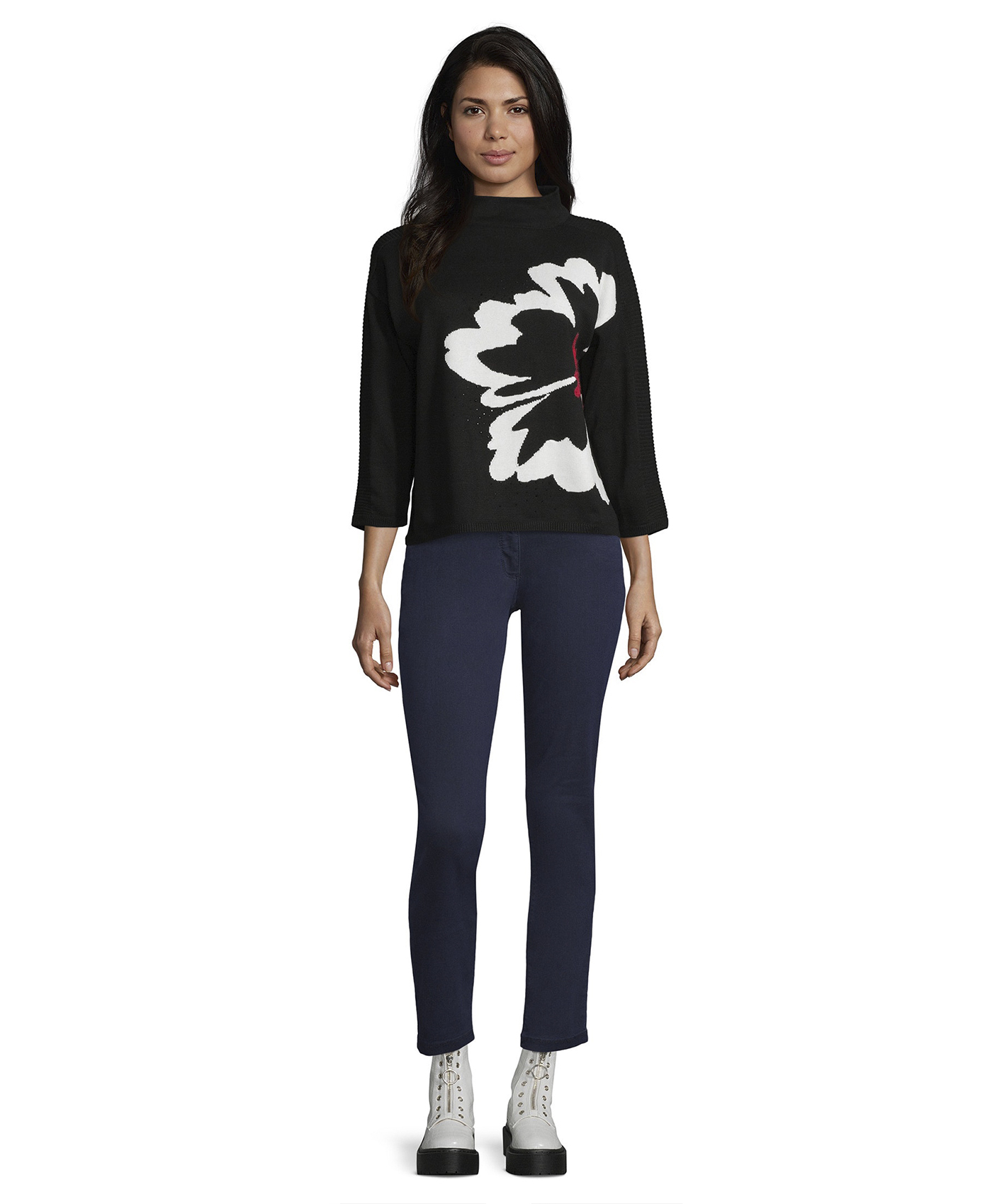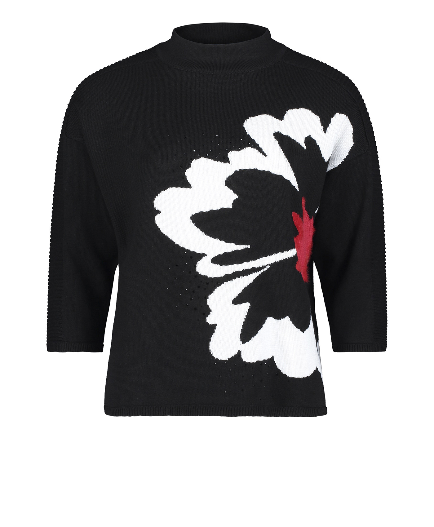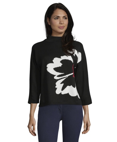 Джемпер прямого покроя - обязательная вещь в любом гардеробе! Горловина "воронка", рукава 3/4 со спущенным плечом. Яркая деталь дизайна - цветок, выполненный нитью контрастного цвета. Россыпь страз придает образу гламурный блеск. Материал из хлопковой смеси приятен к телу. Джемпер прекрасно сочетается с любым однотонным вариантом низа и любой обувью.
