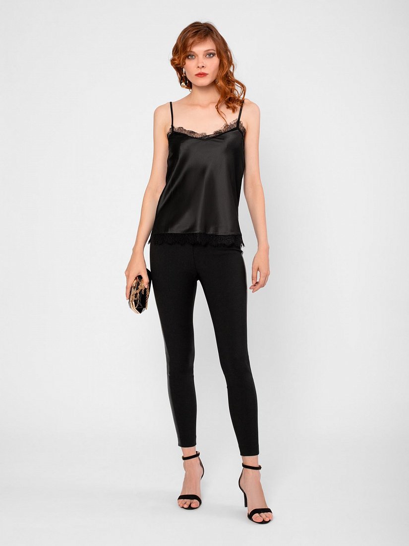 Топ прямого силуэта на бретелях с v-образным вырезом горловины. Бретели, вырез и низ изделия декорированы кружевом.