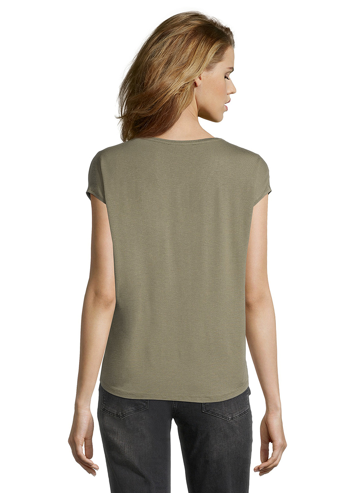 Базовая футболка свободного покроя будет уместна в любом гардеробе! V-образный вырез горловины, короткие цельнокроеные рукава. Приятный к телу материал из шелковой смеси. Шелковый блеск переда придает шик и элегантность всему образу.