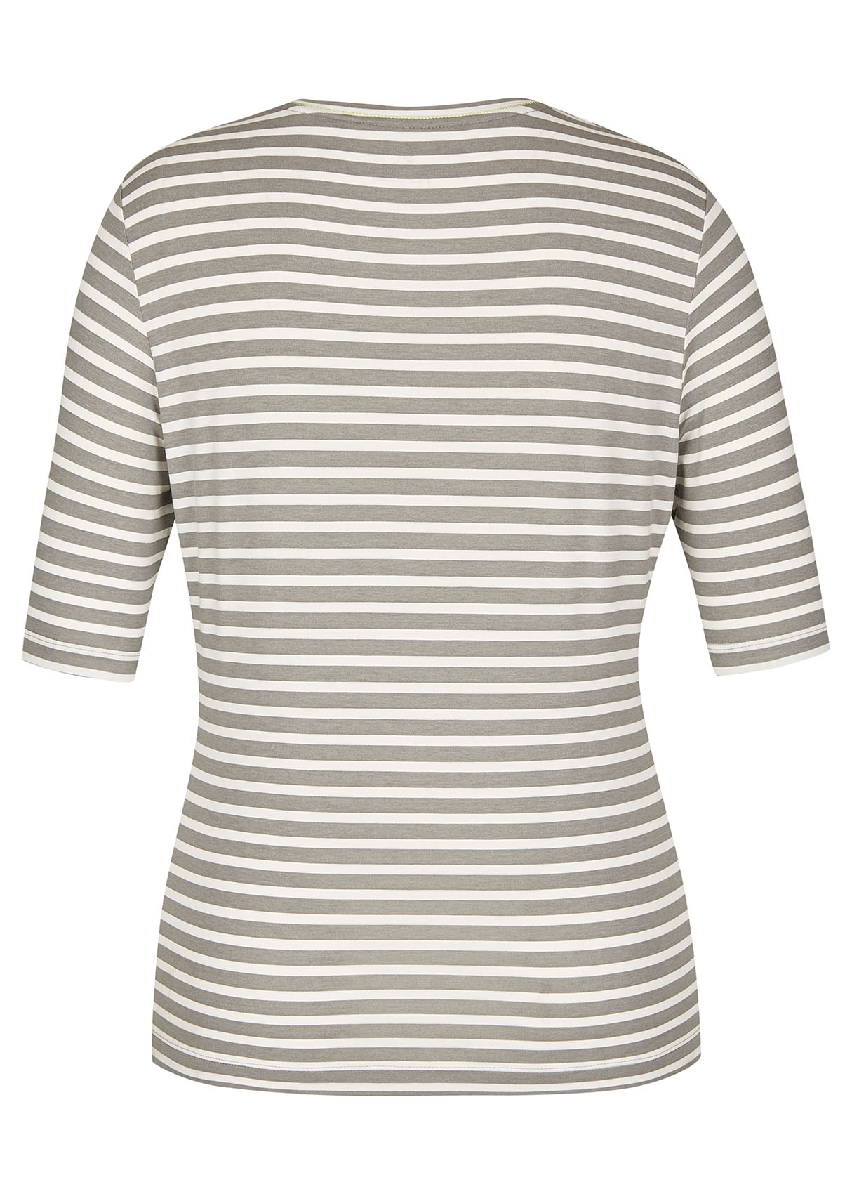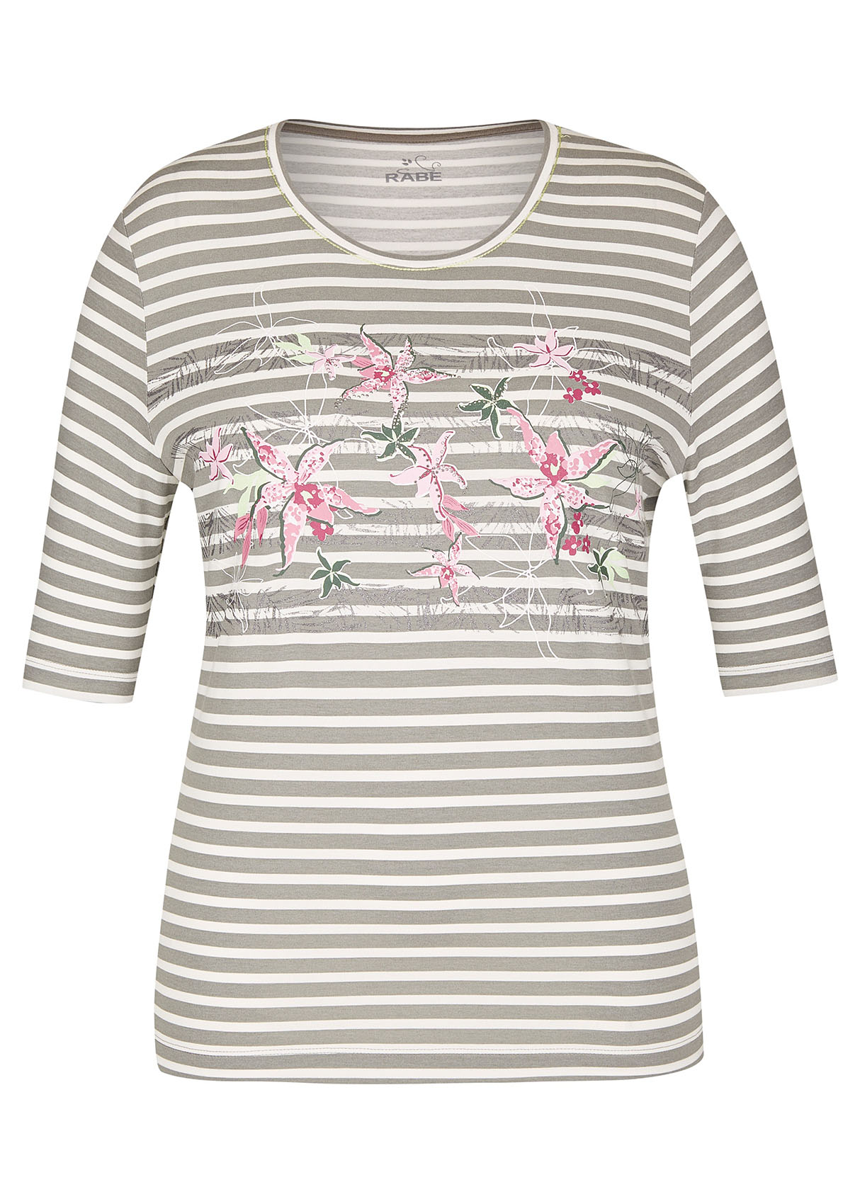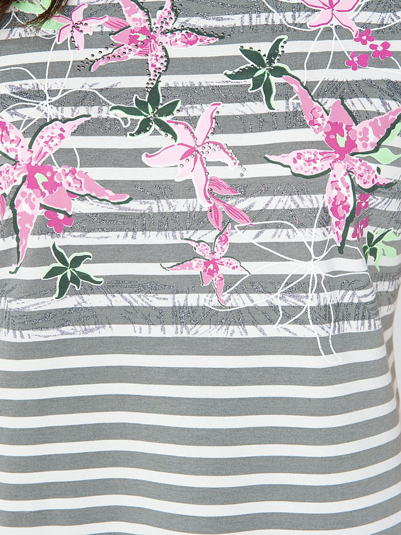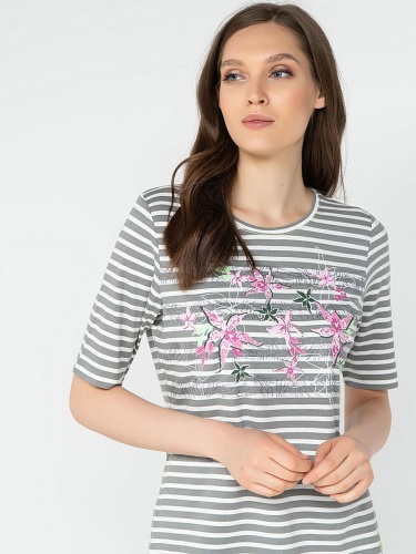 Полоска и тропические цветы - отличное сочетание трендовых мотивов! Приятный к телу материал из смеси вискозы и эластана гарантирует отличную посадку, а рукав 1/2 придает образу легкость и непринужденность. Футболка будет замечательным компаньоном как в брючном, так и в юбочном комплекте.