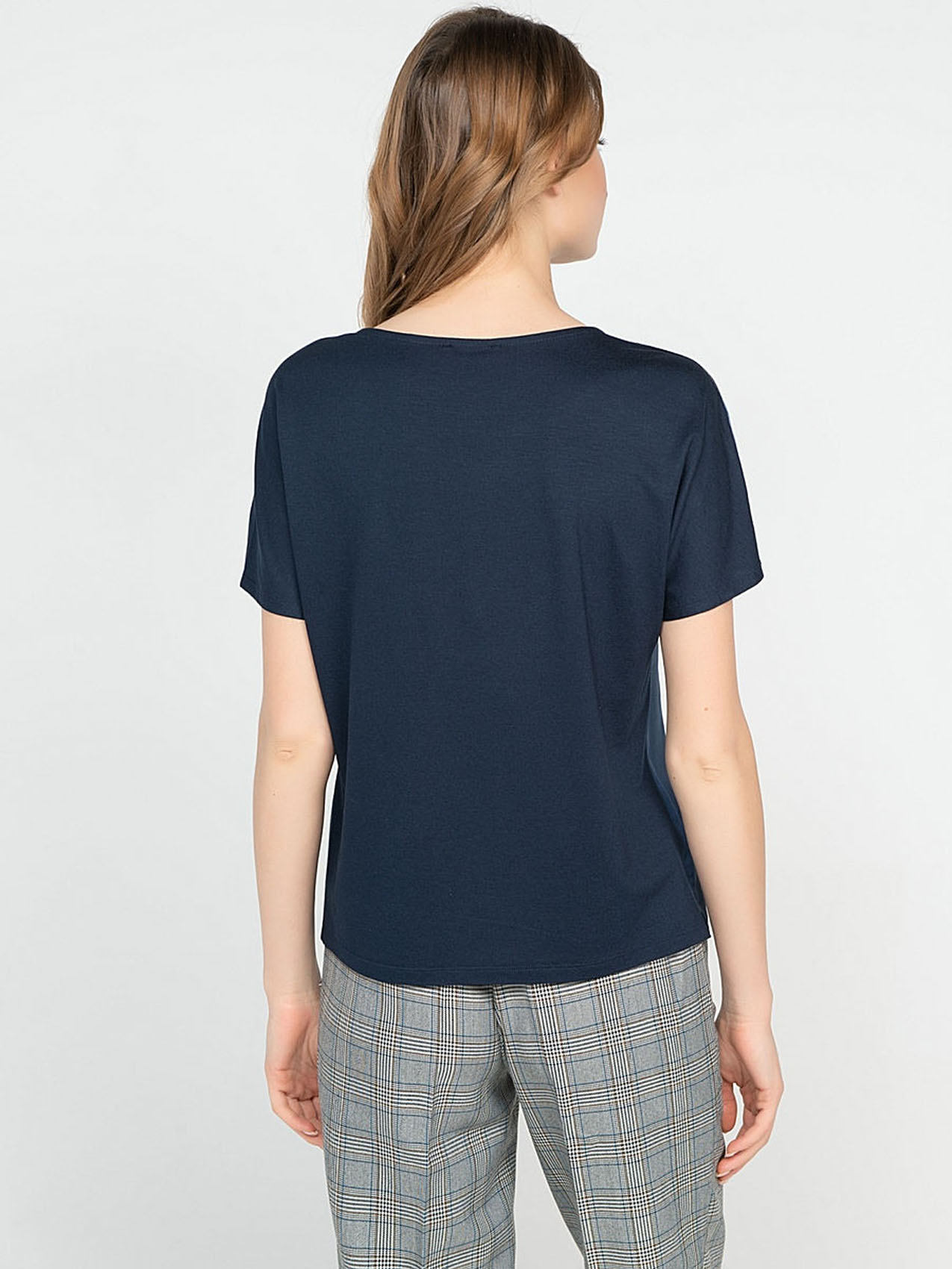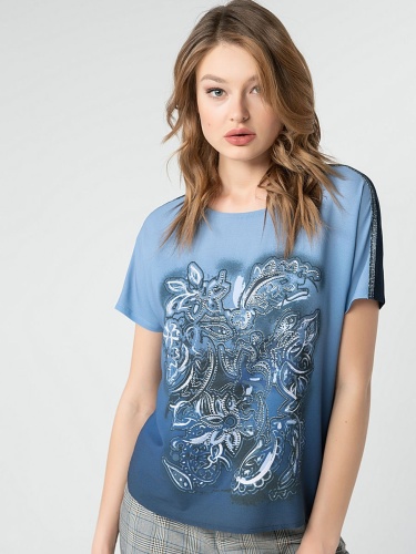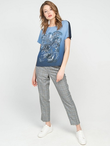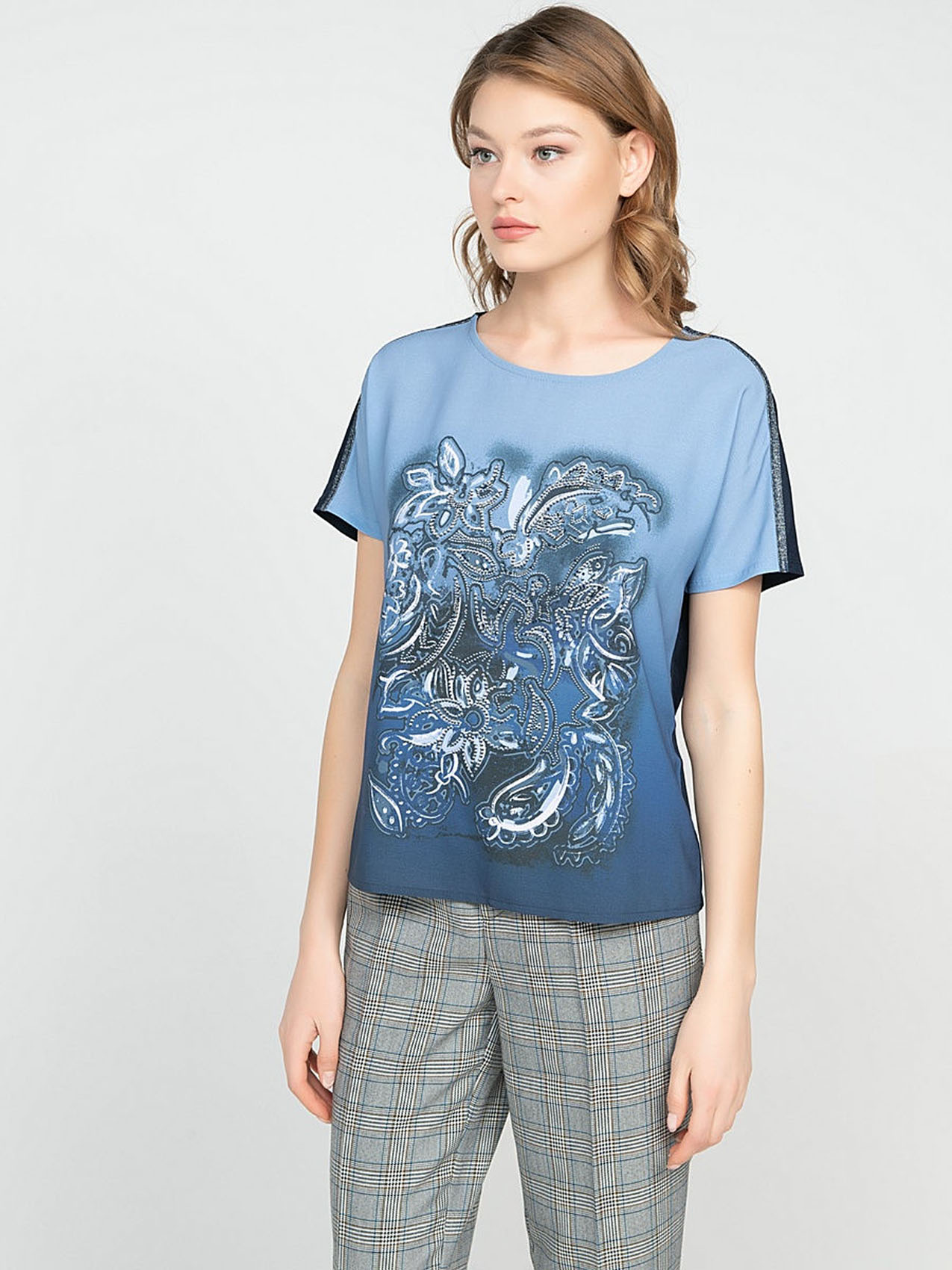 Великолепное сочетание трендов - нежный сине-голубой градиент и цветочный принт на переде футболки. Спинка футболки выполнена из однотонного темно-синего материала. Элегантный акцент - декоративная лента по линии плеча. Мягкий материал из смеси вискозы и эластана гарантирует отличную посадку, а короткий цельнокроеный рукав придает образу легкость и непринужденность. Футболка будет замечательным компаньоном как в брючном, так и в юбочном комплекте.
