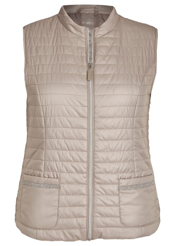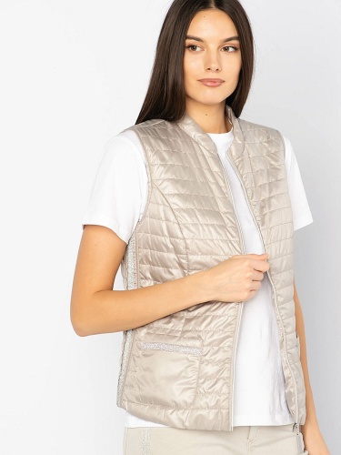 Великолепный стеганый жилет из легких синтетических волокон. Небольшой воротник-стоечка. Замок по всей длине и карманы спереди обеспечивают удобство. Завершает дизайн декоративная лента на карманах.