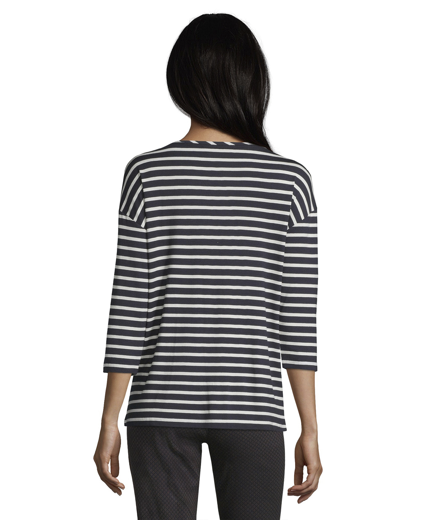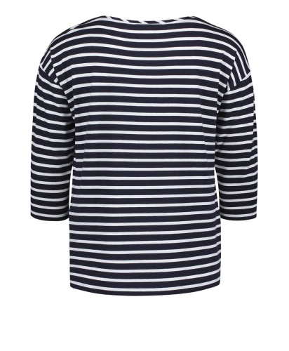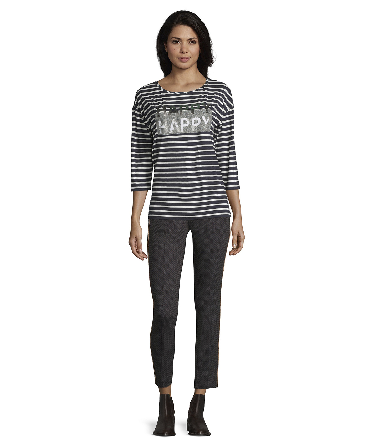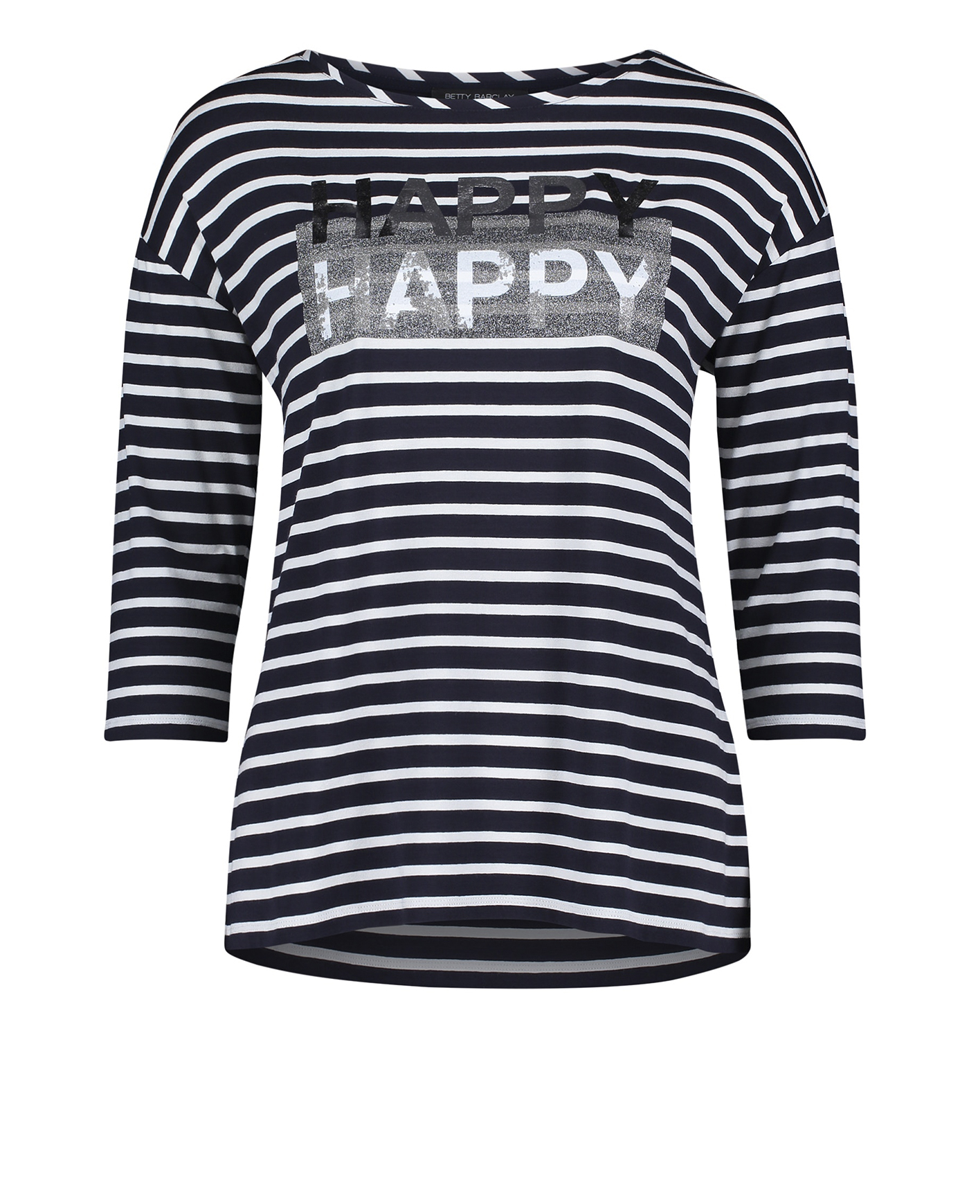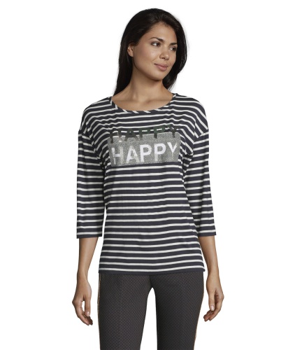 Стиль на каждый день! Полосатый дизайн - излюбленный выбор французских модниц. Футболка прямого покроя. Рукава 3/4 со спущенным плечом. На передней части футболки - металлизированный принт с надписью "Happy". Материал из хлопковой смеси приятен к телу и обеспечивает комфорт. Эта футболка - отличный вариант верха для образа в стиле кэжуал.