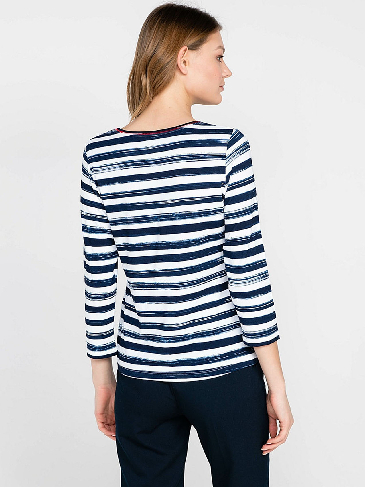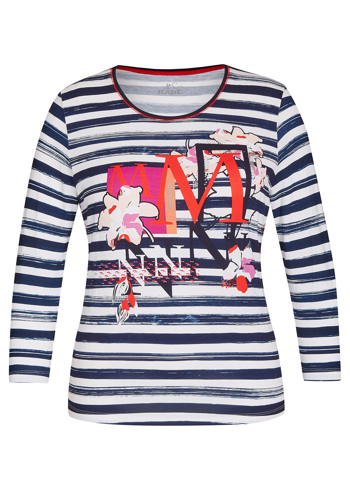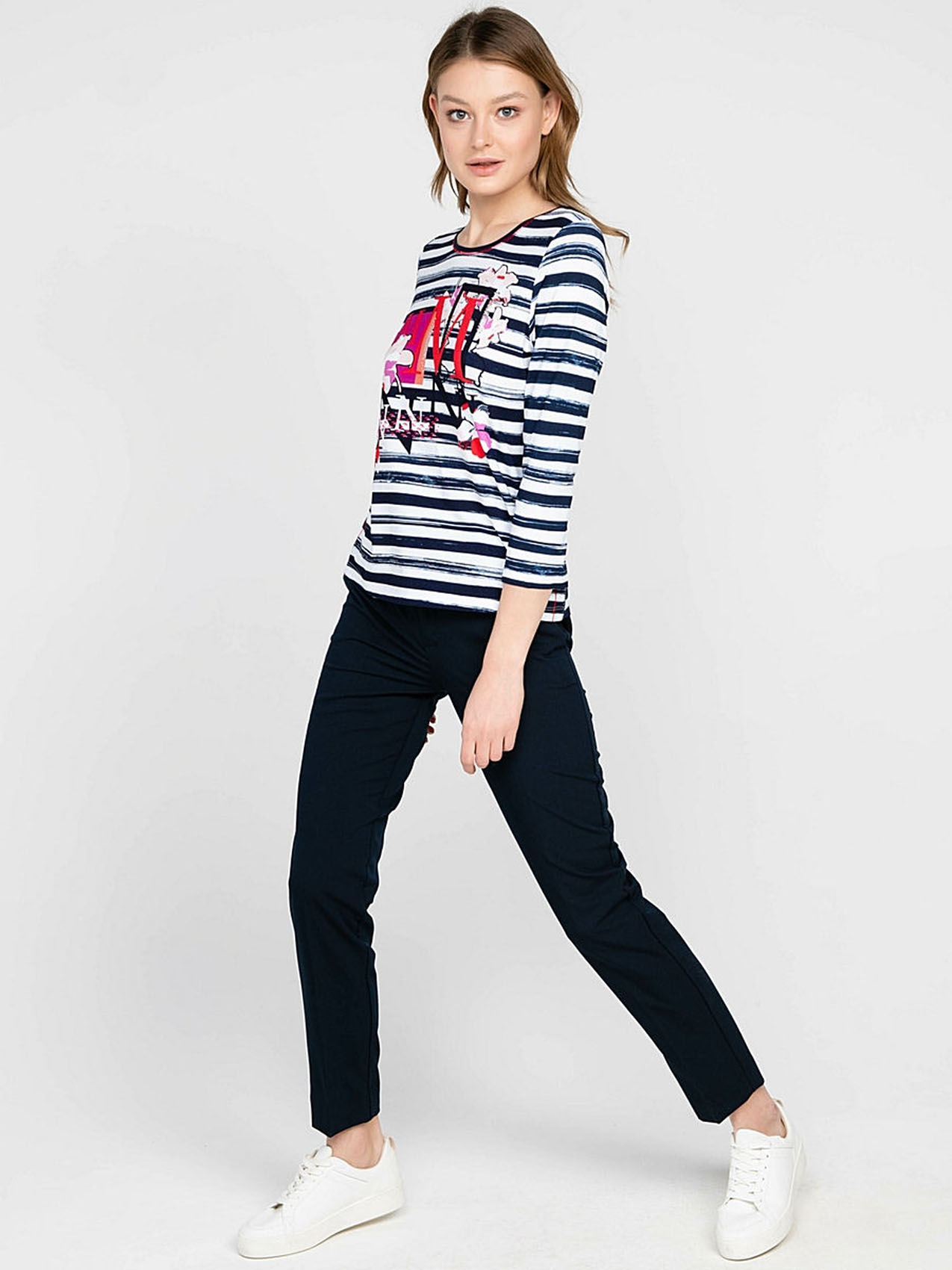 Полосатый дизайн и тропические цветы - то, что нужно для летнего образа! С брюками или с юбкой - эта футболка одинаково удачно выражает индивидуальность своей обладательницы. Приятный к телу материал из смеси вискозы и эластана гарантирует отличную посадку, а рукав 3/4 придает образу легкость и непринужденность. Длина изделия по спинке - 62 см.
