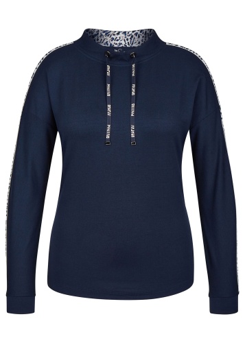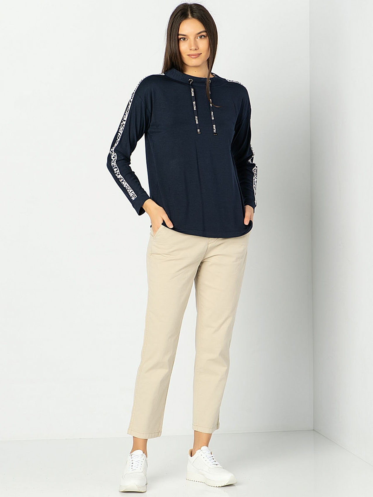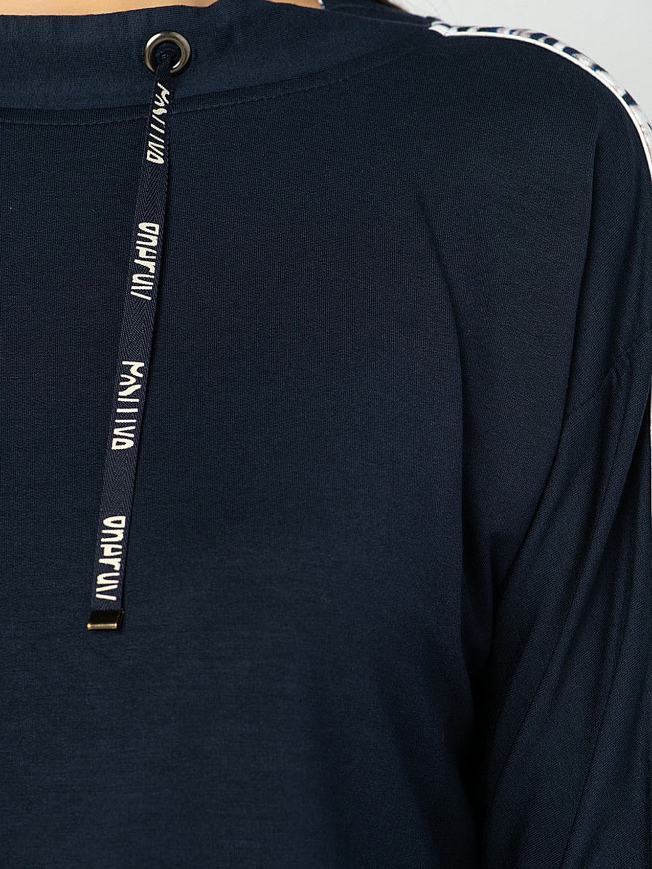 Футболка-лонгслив с манжетами. Приятный к телу материал из смеси вискозы, модала и эластана гарантирует отличную посадку, а прямой крой и рукав с опущенным плечом обеспечивают свободу движений. Полосы на плечах и рукавах и завязки на воротнике завершают дизайн и придают спортивный вид. Интересная деталь дизайна футболки - леопардовый принт на подкладке воротника.