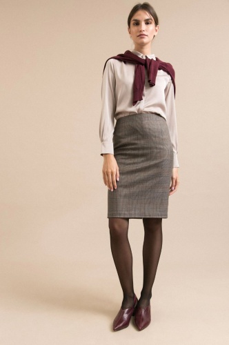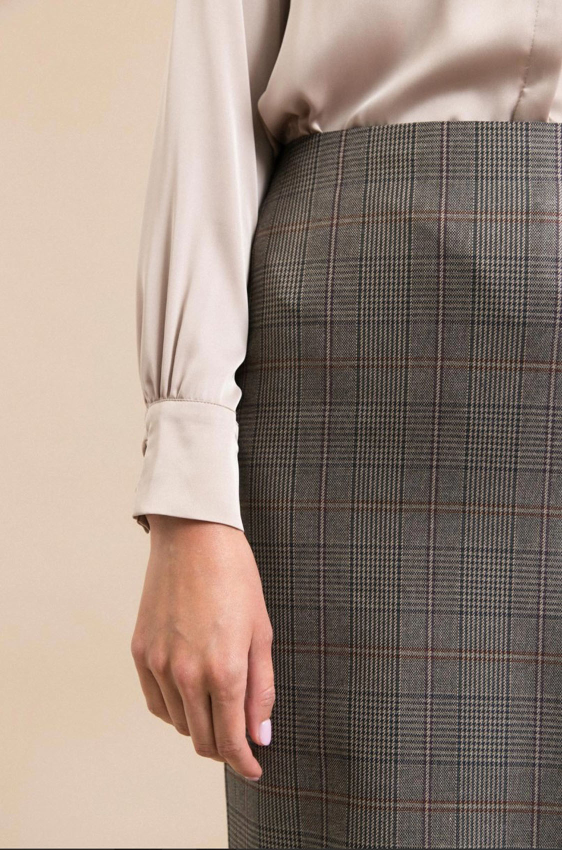 Зеленая юбка в клетку. Зауженная модель средней посадки, выполнена без пояса. Сзади в среднем шве расположена застежка-молния и высокая шлица. Юбка служит базовой моделью в гардеробе для формирования образов в любых стилистических направлениях.