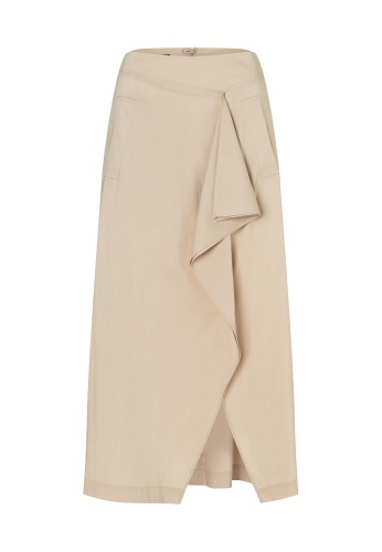 Стильная юбка А-силуэта. Привлекающая внимание деталь дизайна - волан, переходящий в разрез на передней части юбки. Застежка-молния сзади. Приятный к телу материал из хлопковой смеси.