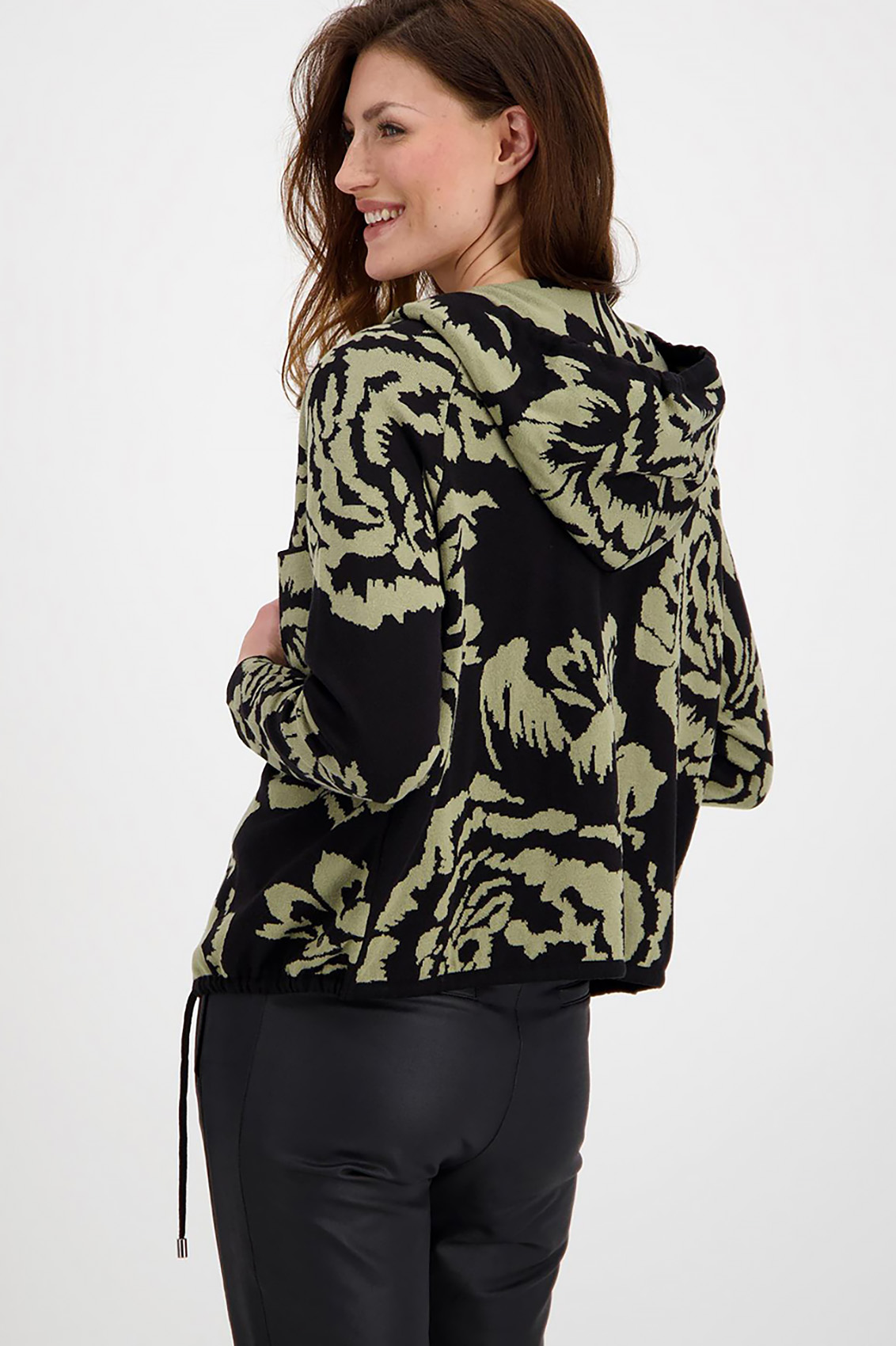 Джемпер на молнии с капюшоном – яркий вариант для образа в стиле кэжуал. Актуальная цветовая гамма и трендовый растительный принт. Рукав-реглан полной длины, один из рукавов украшает лампас. Ассиметричные вставки на груди, по низу изделия кулиска.