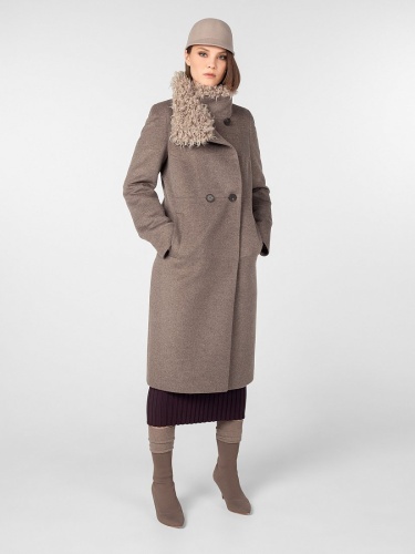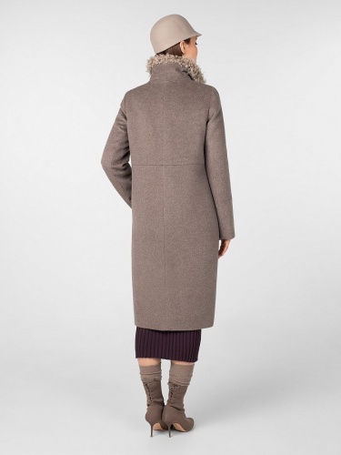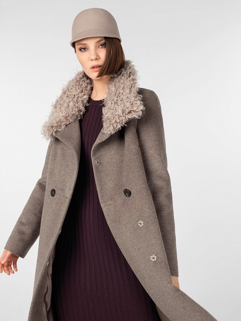 Пальто прямого силуэта длиной чуть ниже колена. Втачной рукав, застёжка на роговые пуговицы, широкий воротник-стойка, вертикальные карманы-листочки. Горизонтальные подрезы на полочке, спинке и рукавах. Съёмный воротник-стойка из искусственного меха. Произведено с ветрозащитной мембраной Raft Pro. Утеплитель DuPont Sorona из биопуха. Изготовлено из шерстяной ворсовой ткани цвета "бежевый меланж".