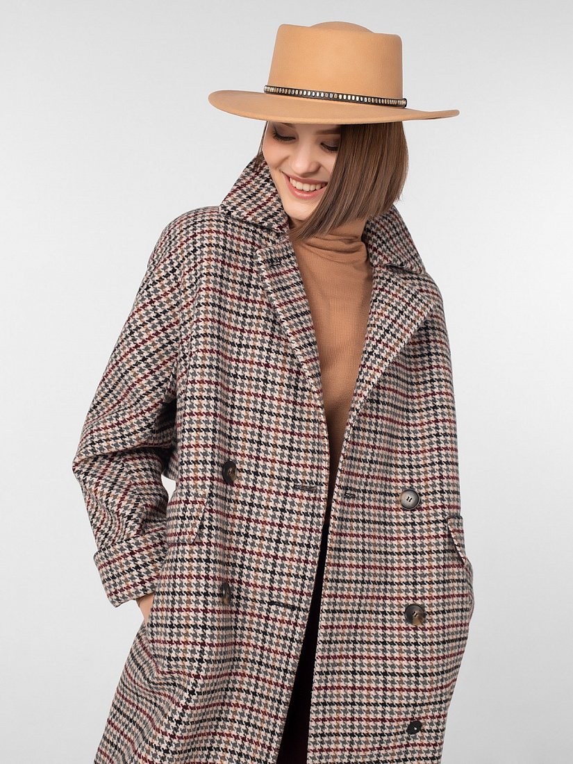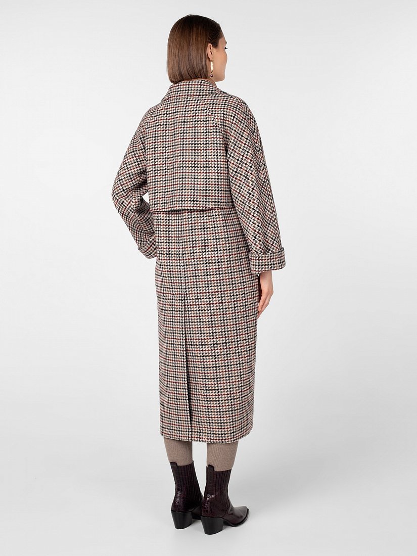 Двубортное пальто силуэта "длинный кокон" длиной до середины икры. Рукава-кимоно с отворотом по низу, застёжка на роговые пуговицы, английский воротник, карманы с декоративными клапанами, широкая отлетная кокетка на спинке, шлица в среднем шве. Произведено с ветрозащитной мембраной Raft Pro. Изготовлено из шерстяной ткани с рисунком "пье-де-пуль".