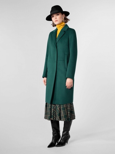 Пальто прямого силуэта длиной выше колена. Втачной рукав, застёжка на пришивные кнопки, английский воротник, горизонтальный подрез на полочке и спинке, вертикальные карманы-листочки. Ветрозащитная мембрана Raft Pro. Изготовлено из ворсовой шерстяной ткани изумрудного цвета.
