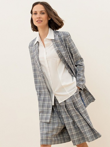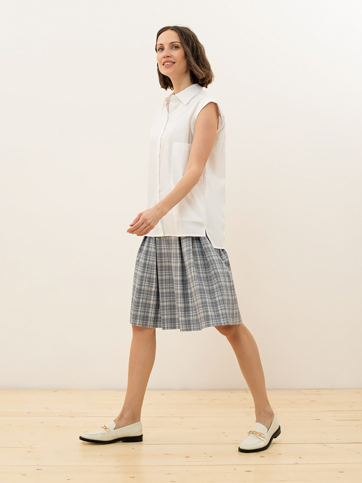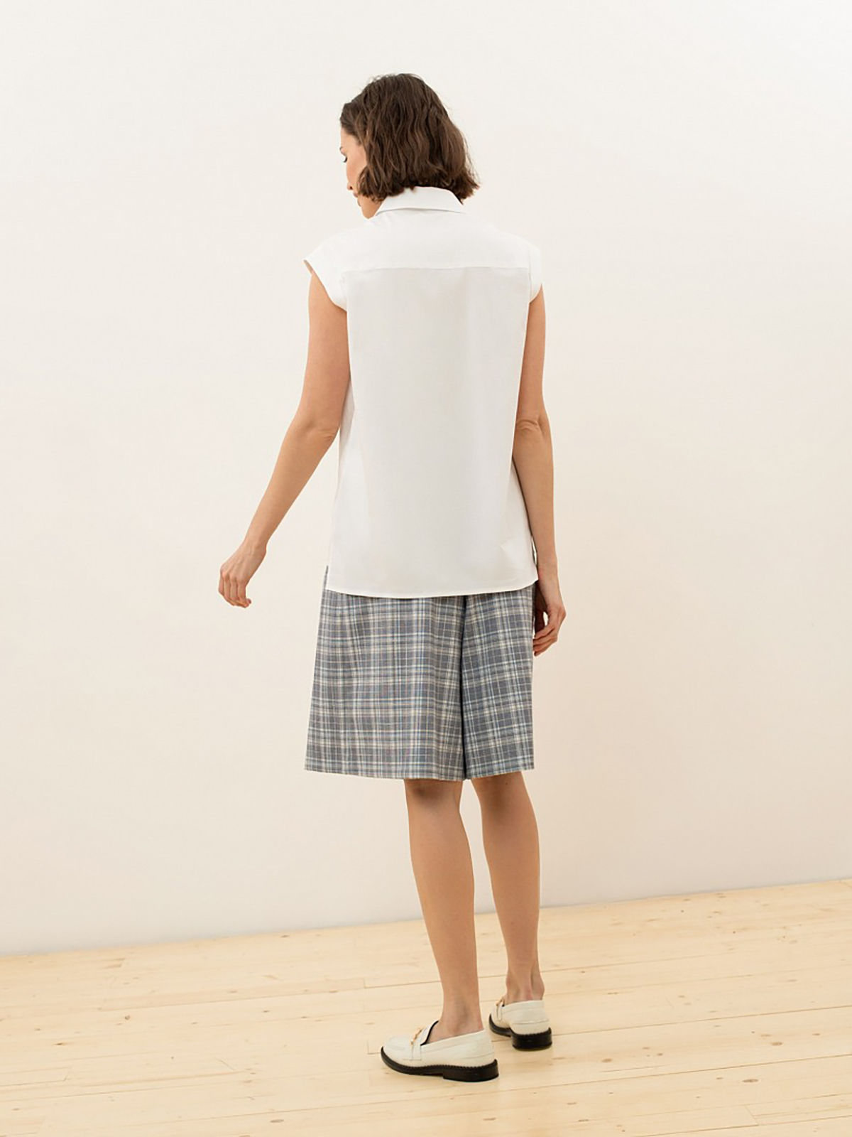 Блуза прямого силуэта с рубашечным воротником . На полочке накладные карманы, по спинке кокетка.