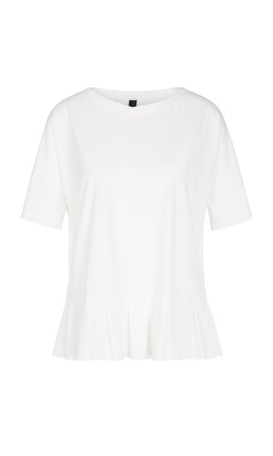 Лаконичная белая блуза. Прямой крой, круглый вырез горловины, короткие рукава. Волан по низу изделия.