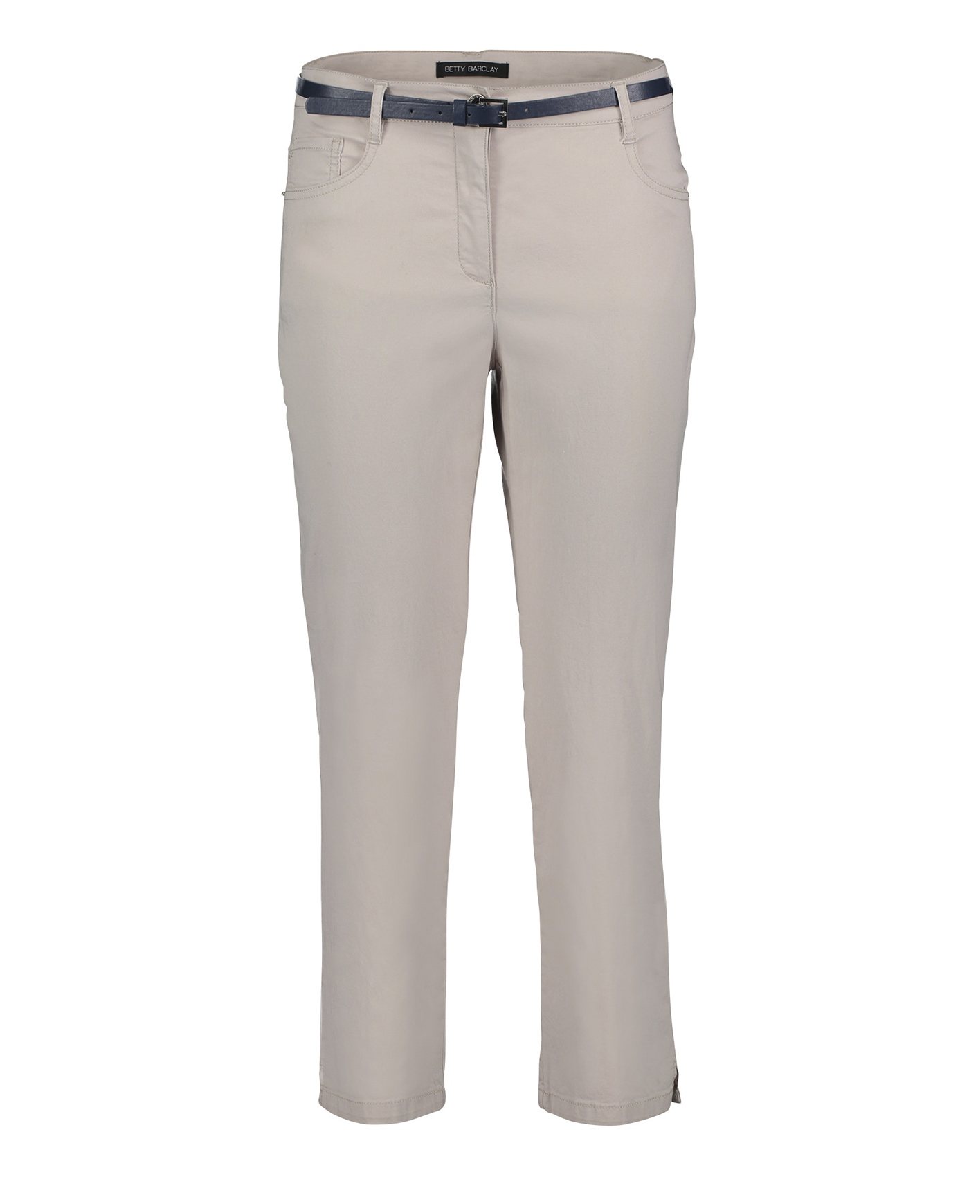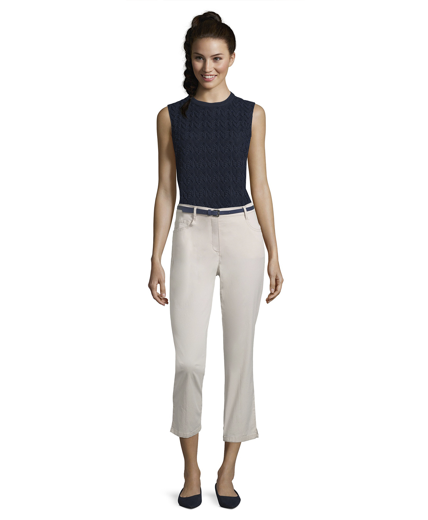 Укороченные брюки слегка расклешенного кроя обращают на себя внимание. Универсальная средняя посадка. Небольшие разрезы снизу по боковым швам. Приятный к телу материал из хлопковой смеси обеспечивает комфорт в ношении. В сочетании как с футболкой, так и с блузой эти брюки создают стильный современный образ.