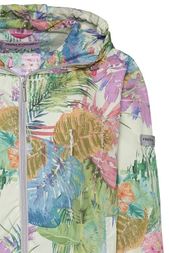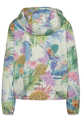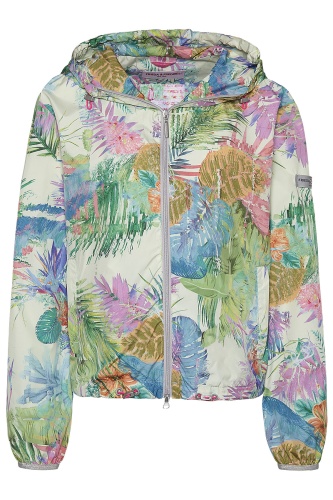 Плохое настроение в дождливую погоду? Только не в этой ветровке! Легкая ветровка не только воздухопроницаемая, ветро- и водоотталкивающая, но и благодаря яркому тропическому принту гарантирует хорошее настроение. • капюшон на кулиске • кулиска по низу изделия • трикотажные манжеты на рукавах • яркий тропический принт