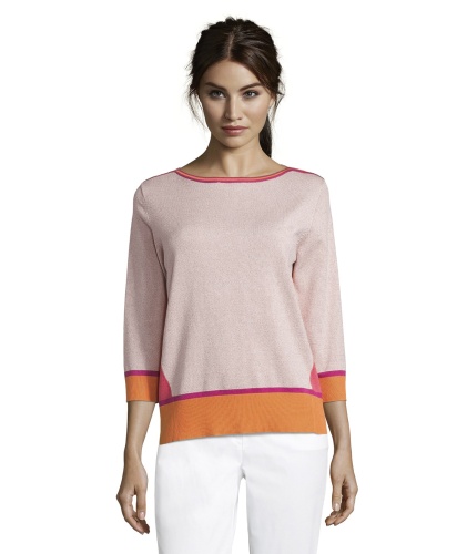 Новая вариация модного дизайна в стиле колор-блок! Прямой покрой, вырез горловины "лодочка", рукава 3/4. Материал из вискозной смеси приятен к телу и обеспечивает комфорт. Нить люрекса в составе материала придает изделию гламурный блеск. Этот джемпер гарантирует создание современного образа с любым однотонным вариантом низа и любой обувью.