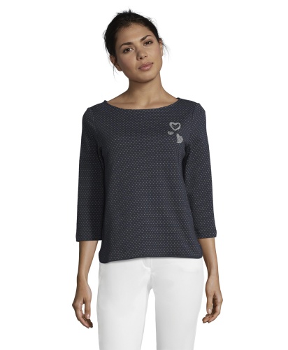 Джемпер прямого покроя с вырезом "лодочка" и рукавами 3/4. Декоративные элементы в форме сердец создают нежный, женственный образ обладательницы джемпера. Хлопковый материал джемпера чрезвычайно уютен. Эта модель отлично смотрится как с брюками, так и с юбкой.