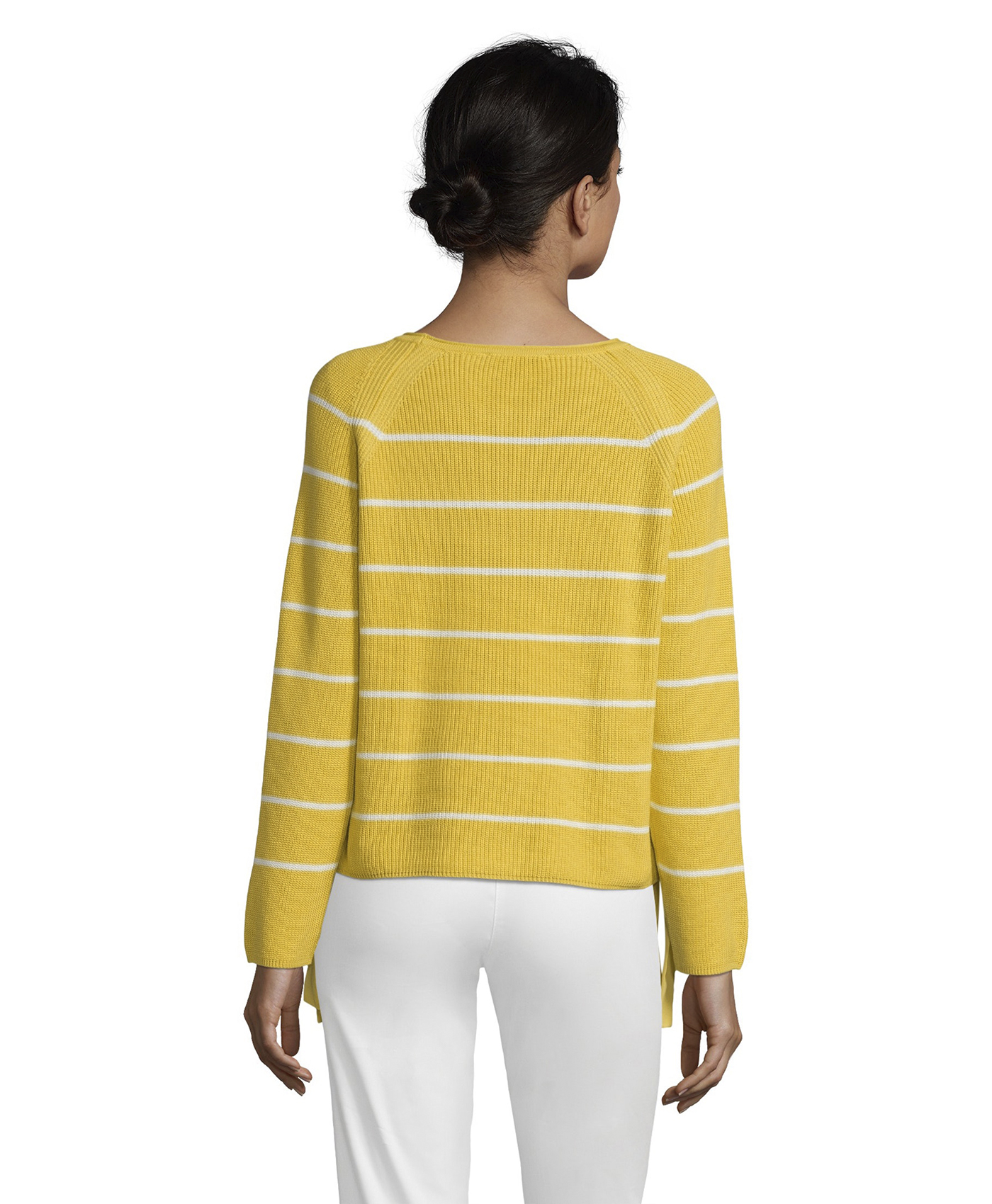 Новая вариация трендовой полоски! Джемпер прямого покроя с длинными рукавами и горловиной-лодочкой. Элемент романтического стиля - декоративные ленты-завязки по бокам. Материал из хлопковой смеси приятен к телу. Этот джемпер создает женственный образ даже в сочетании с брюками.