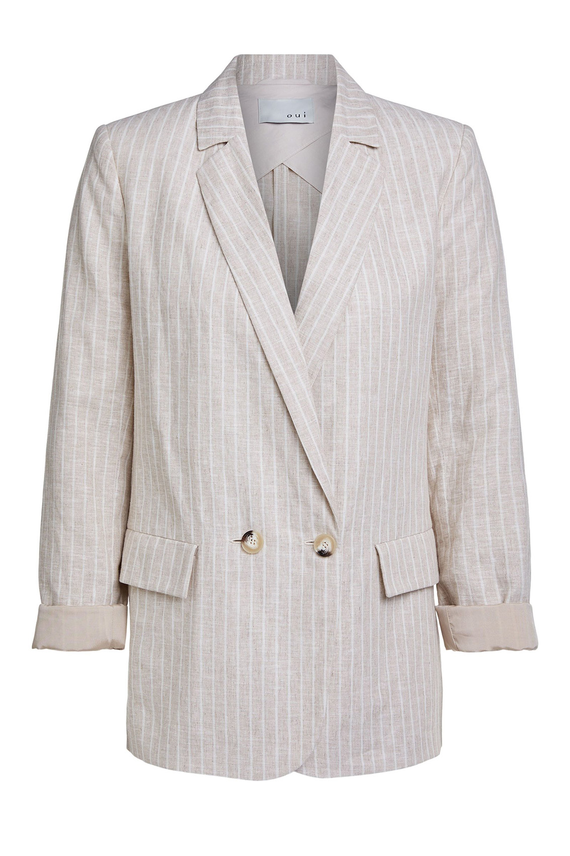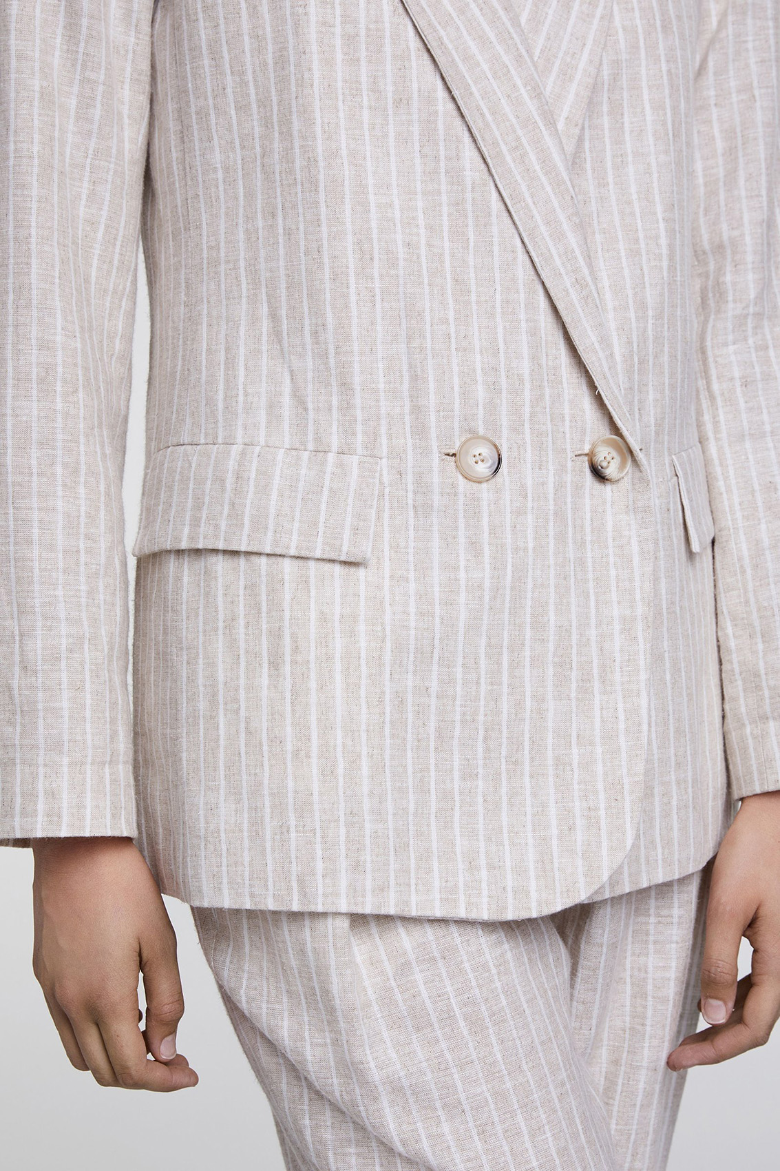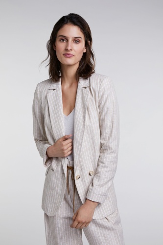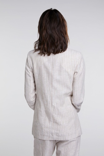 Жакет прямого покроя обязательно должен быть в каждом гардеробе! Отложной воротник с лацканами, застежка на пуговицах. Трендовый принт в полоску. Материал из смеси хлопка и льна приятен к телу и обеспечивает комфорт. Эта модель универсальна и может служить основой как для делового, так и для повседневного образа.