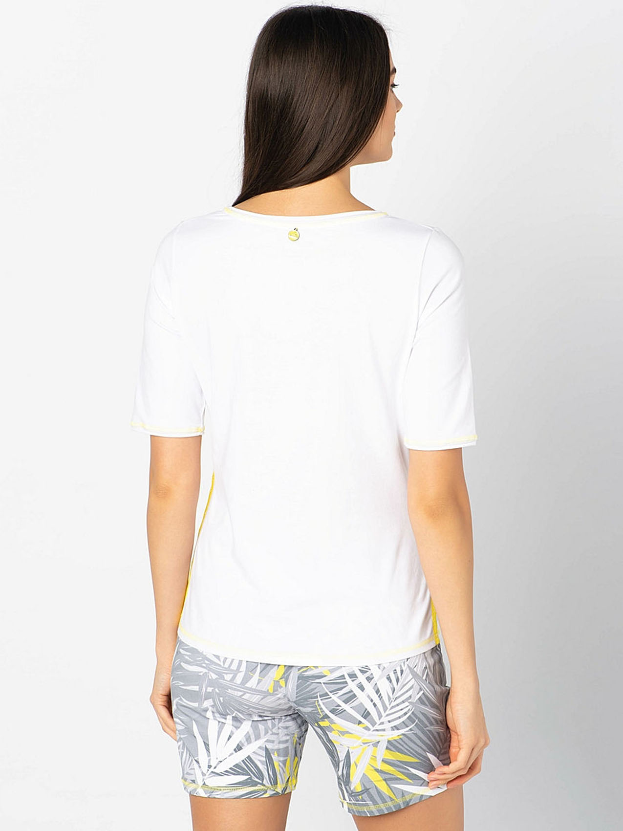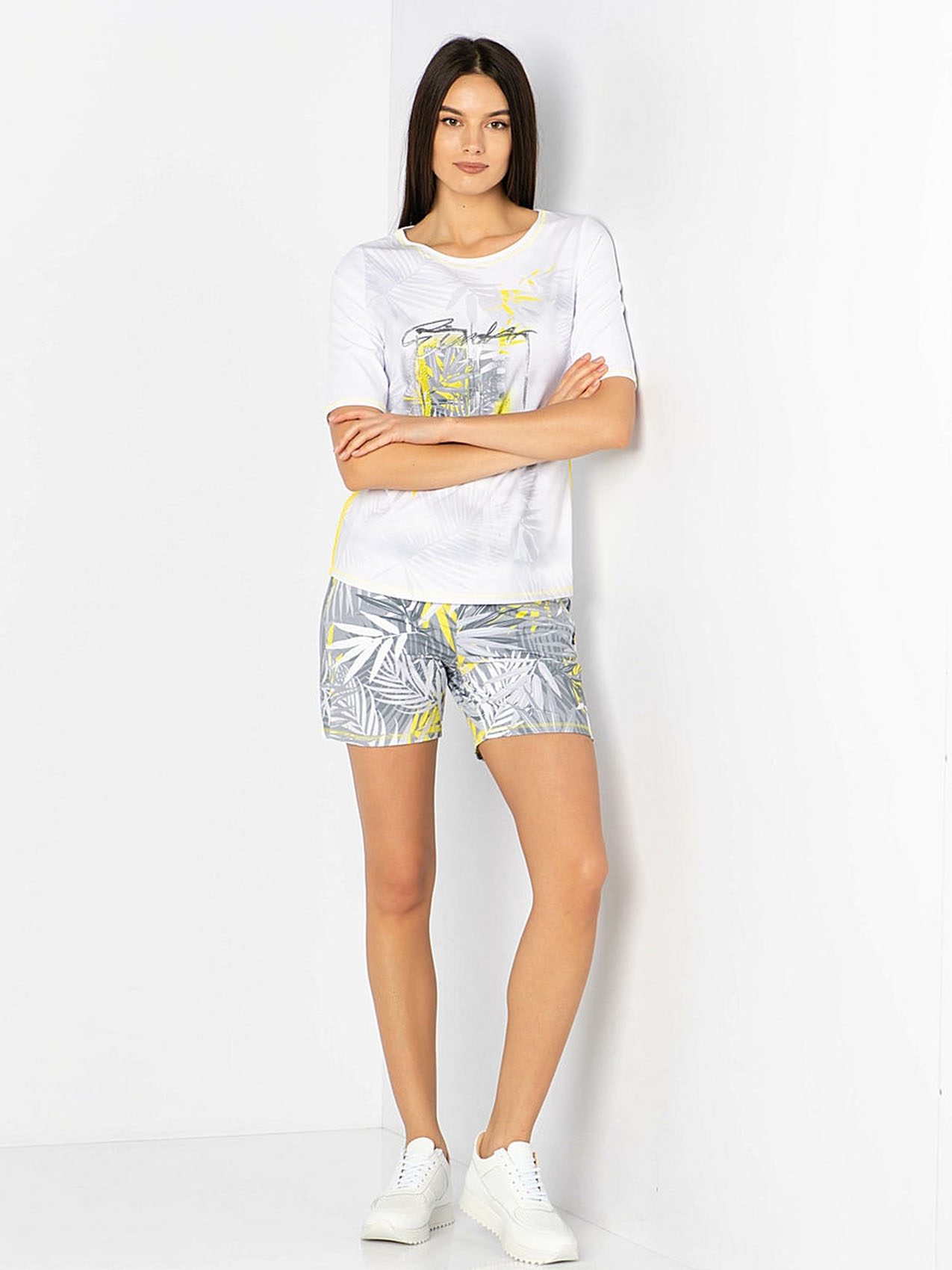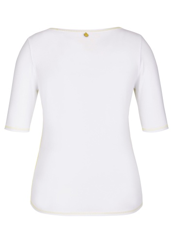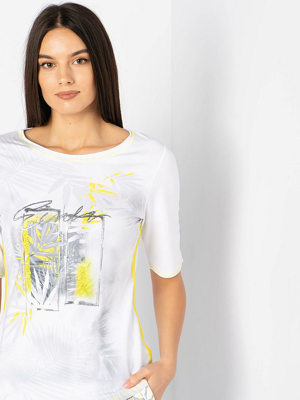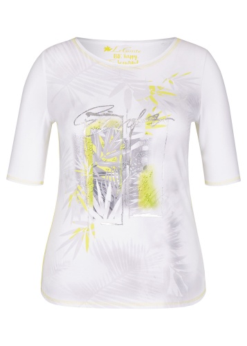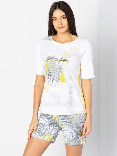 Футболка с трендовым тропическим принтом и яркими акцентами. Яркая декоративная отстрочка. Слегка приталенный силуэт. Вырез "лодочка". Рукава 1/2. Приятный к телу материал из смеси хлопка и эластана. Длина изделия по спинке: 65 см.