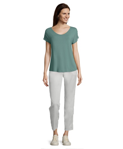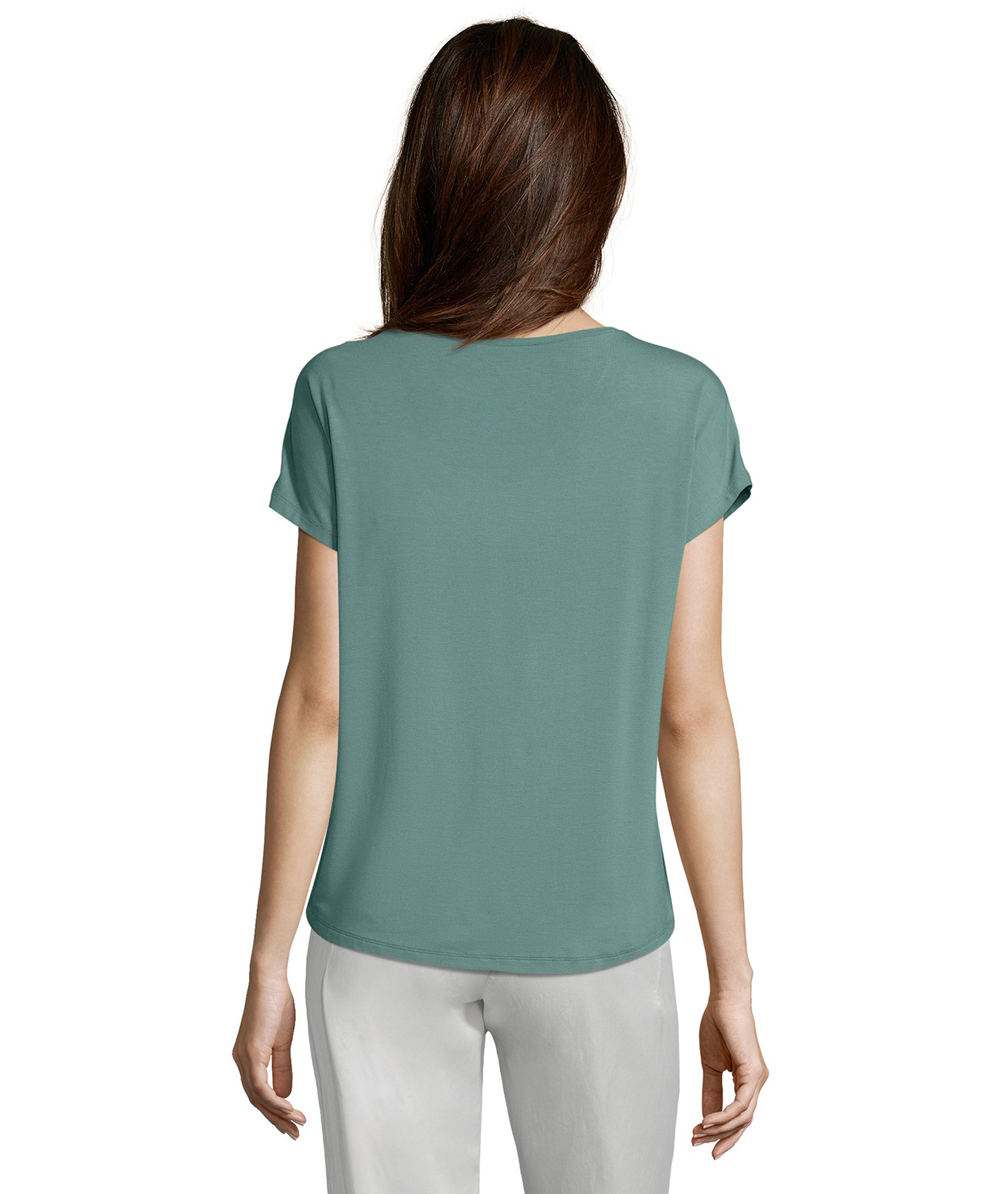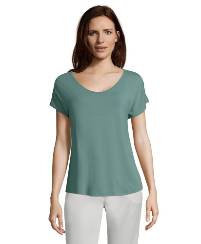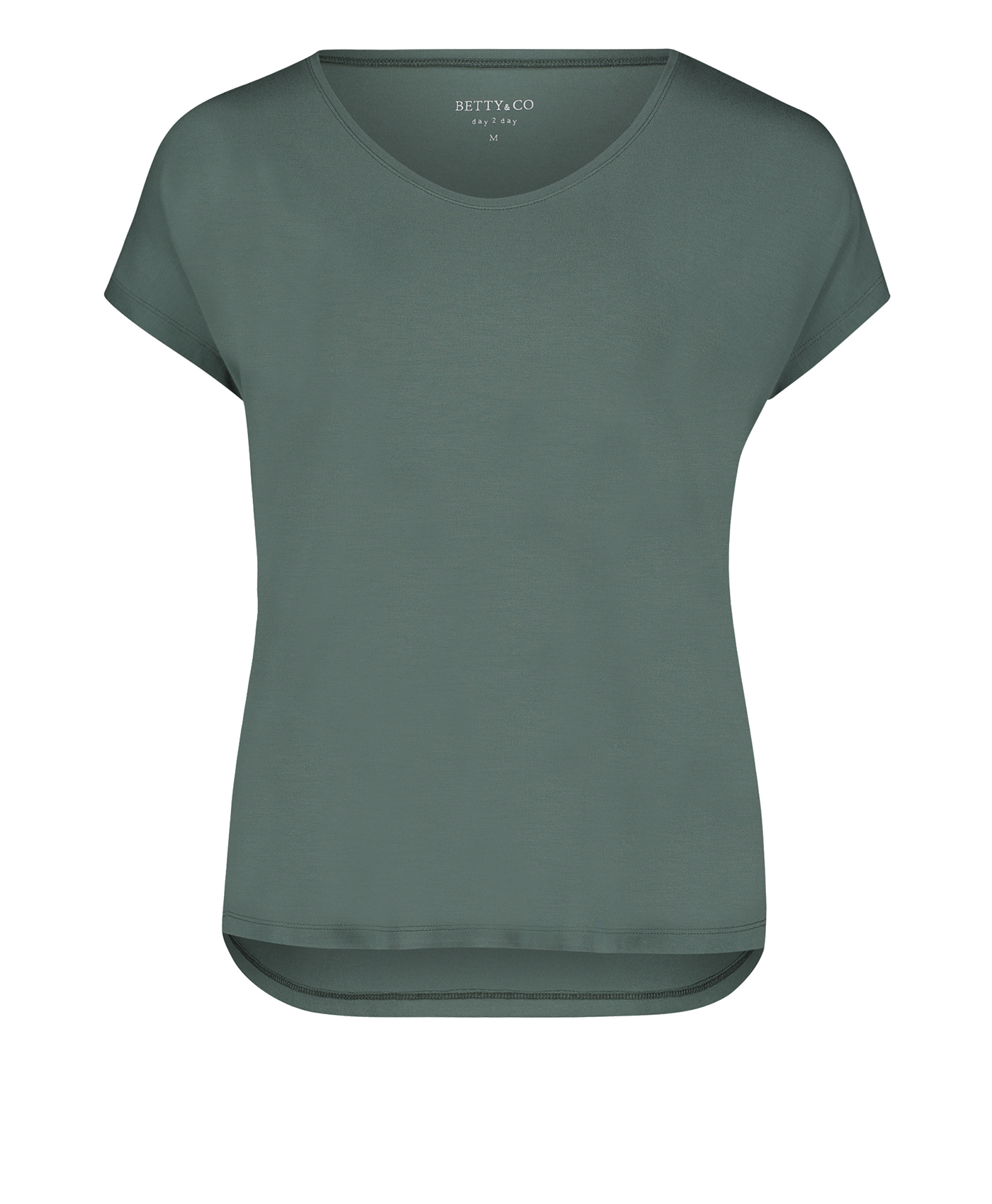 Простая футболка слега приталенного силуэта. Широкий круглый вырез горловины, короткие цельнокроеные рукава. Удлиненная спинка изделия. Материал из смеси вискозы и эластана приятен к телу. Эта модель является базовой, она отлично сочетается с любым комплектом одежды.